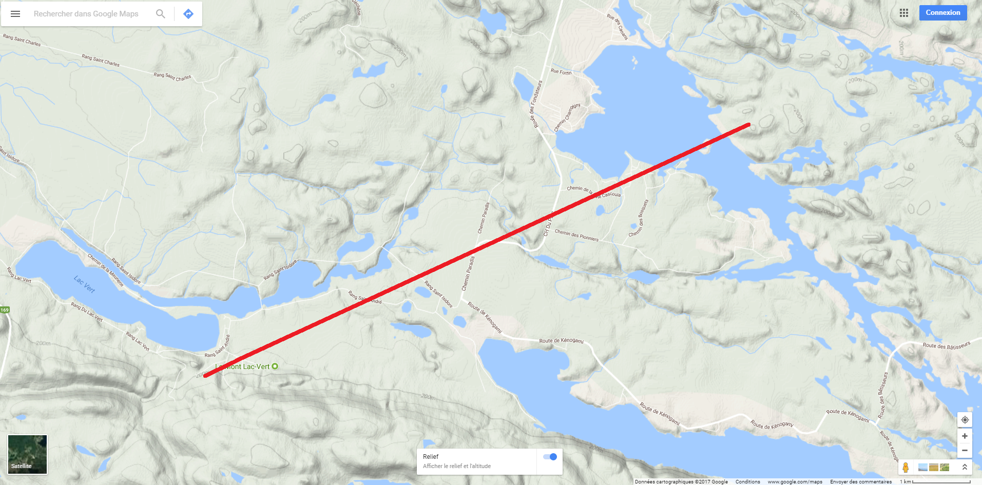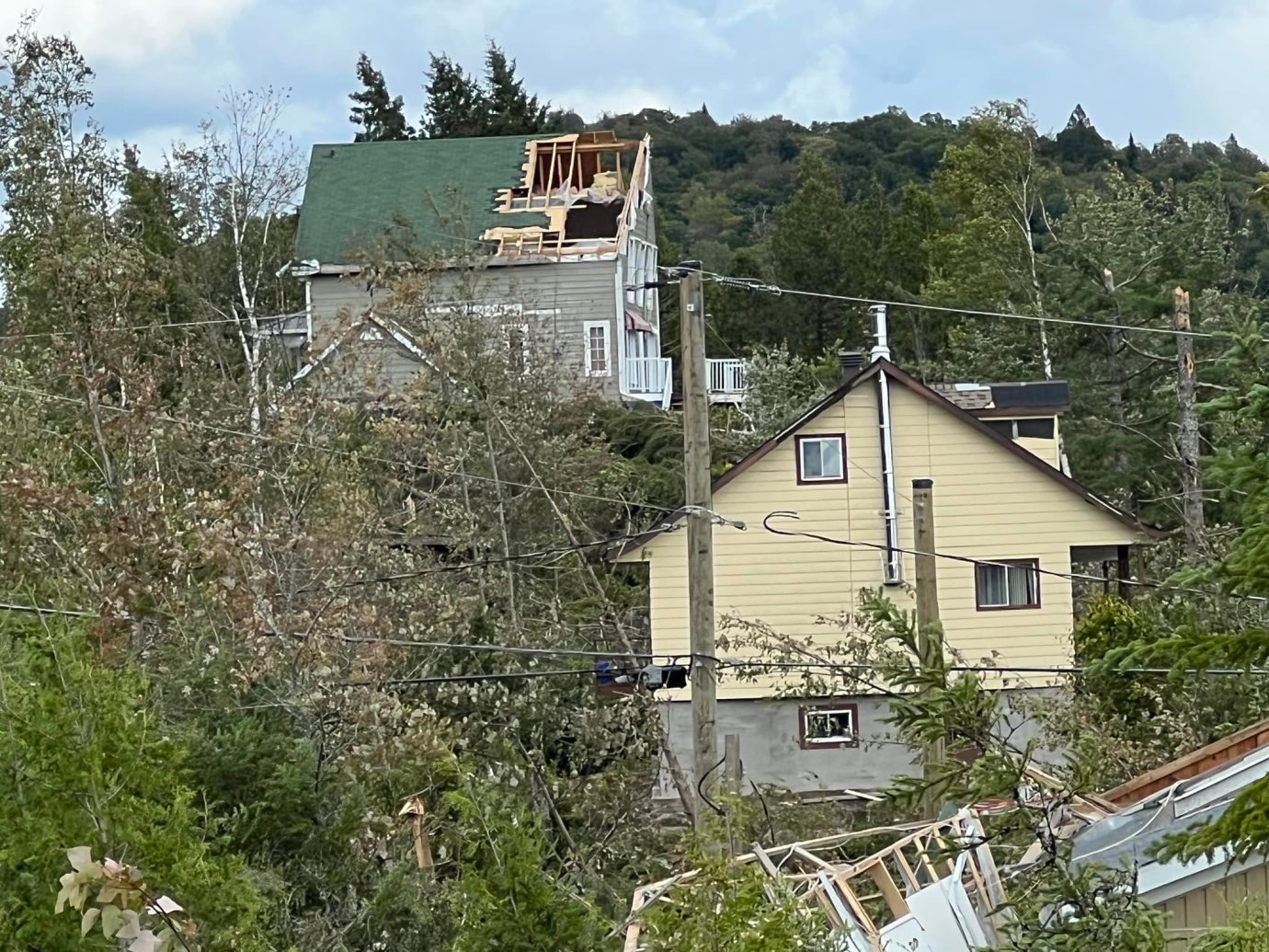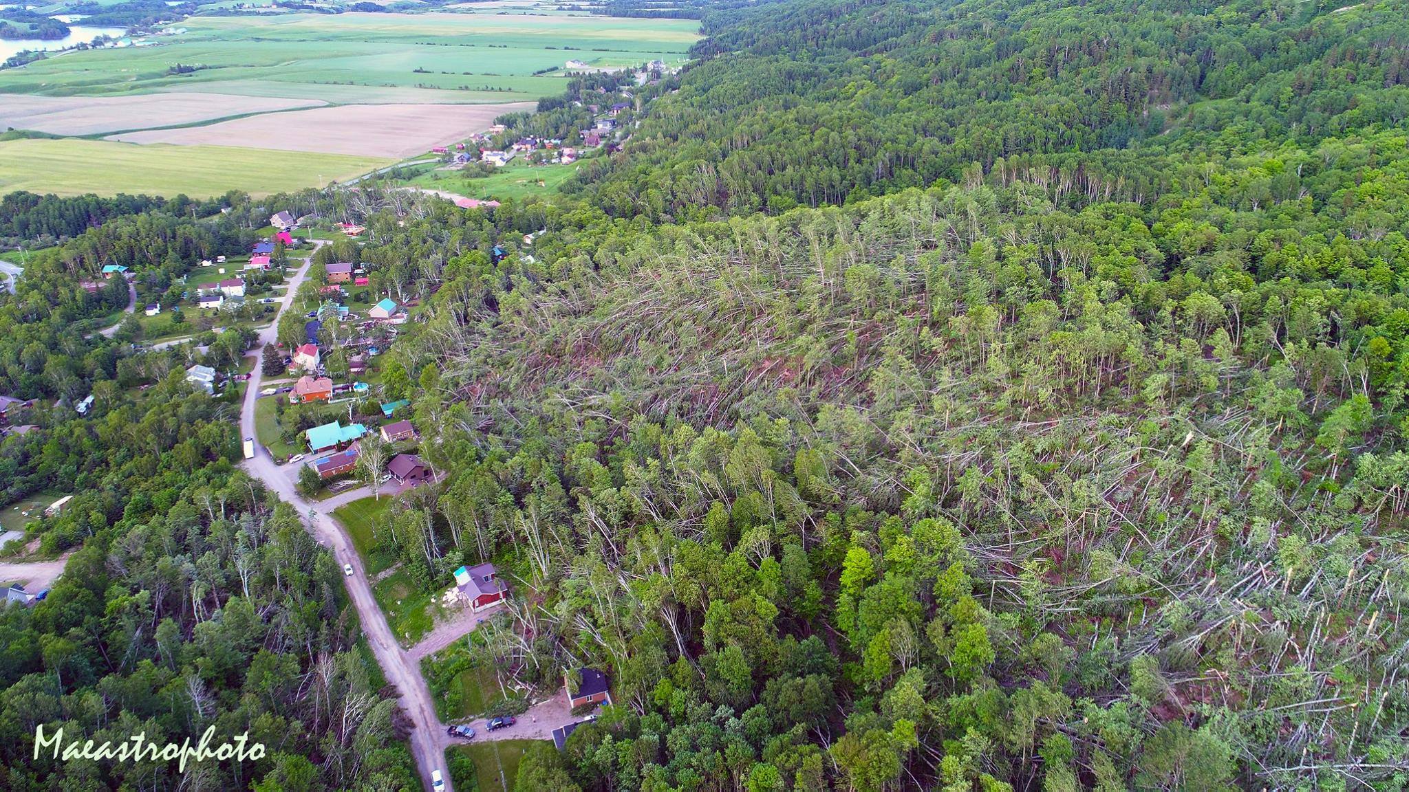 Si on regarde l’endroit du début approximatif de la tornade, on remarquera que cela se fait en sortant non loin des montagnes. Voici deux images prises en hauteur qui donnent un aperçu avec le corridor d’arbres abattus.
