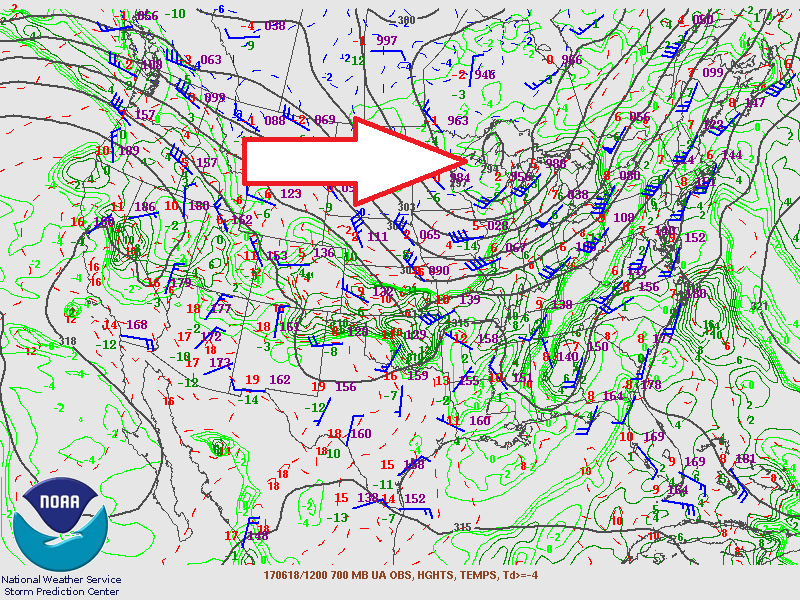 Commençons par regarder l’atmosphère qui était en place pendant la journée. Dès le matin, il était clair qu’un système assez important était situé sur les grands lacs. La prochaine carte démontre le creux qui était visible ce matin-là à 700mb (~3km en altitude).