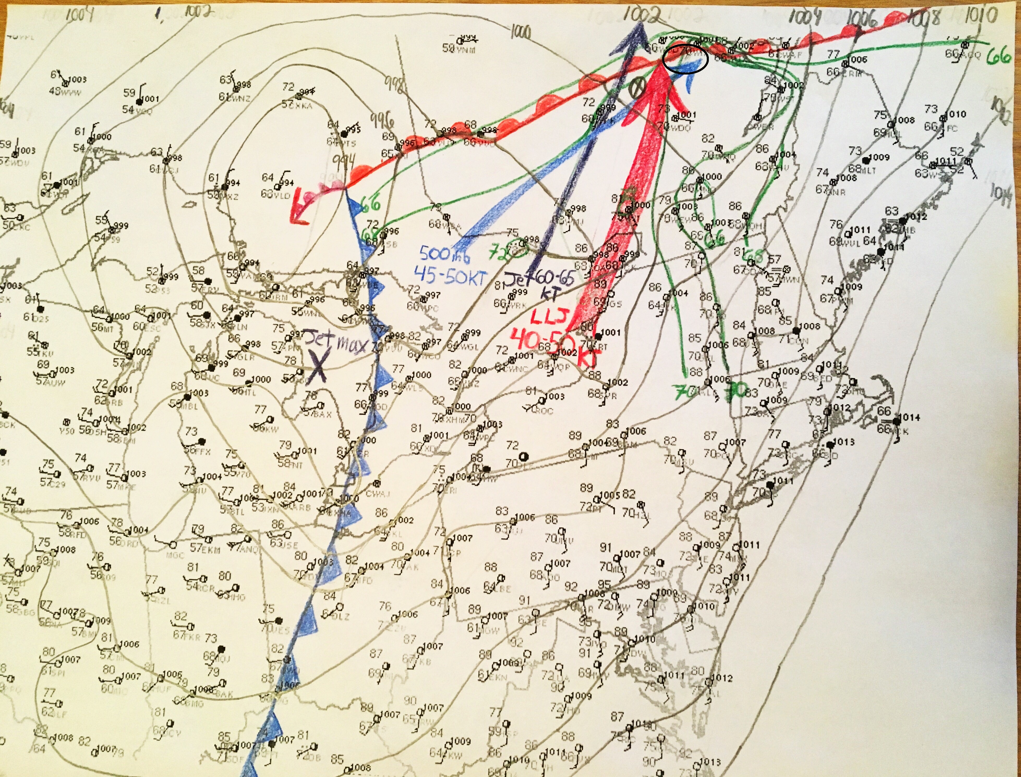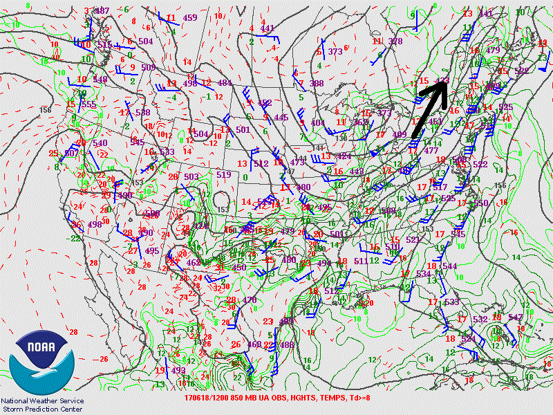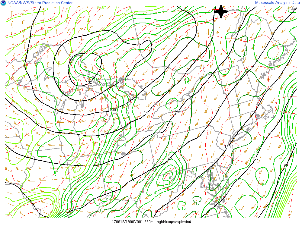 La région affectée par la tornade est entourée de noirs sur l’image. On y retrouve la position du front froid (ligne avec les triangles bleus) qui était encore loin. Le front chaud (ligne avec les demi-cercles rouges) qui s’étendait près de la région. La grosse flèche rouge représente le courant-jet de bas-niveau. Celui-ci entrait sur la région avec force (40-50 noeuds). La flèche bleue foncée parallèle à la rouge indique la position de l’entrée du courant-jet en haute altitude (60-65 noeuds). La flèche bleue pâle perpendiculaire aux autres indique la direction et la vitesse du vent à 500mb (45-50 noeuds). Devant le front, il était intéressant de voir l’advection d’humidité qui rejoignait le front chaud. C’est indiqué par les contours verts.