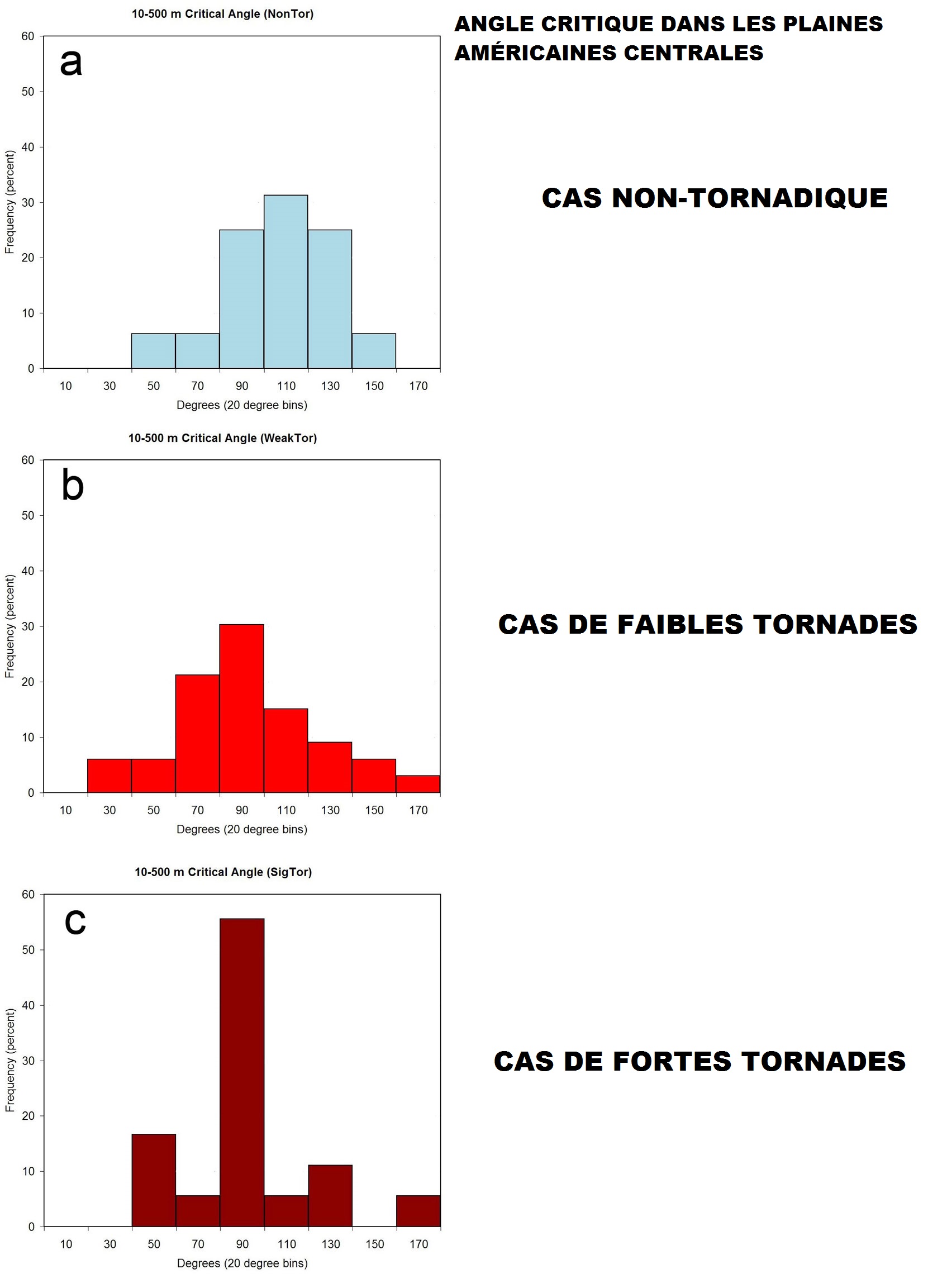 Pour des cas de fortes tornades, il apparaît clairement qu’un angle de 90 degrés (entre 80 et 100) est présent un peu plus de 55% du temps. Cependant le climat des plaines du centre Américain diffère de celui que nous connaissons. Une autre étude a été mener par les météorologues Jared L. Guyer et John A. Hart du Storm Prediction Center (réf: http://www.spc.noaa.gov/publications/guyer/ef3_vwp.pdf ). Celle-ci se concentrait sur la région sud-est des États-Unis. Cette région est reconnue comme étant un peu plus près de la nôtre concernant la formation des tornades. Les cas de tornade avec un faible CAPE et un fort cisaillement y sont plus fréquents, comme ici, que dans les plaines centrale Américaine.