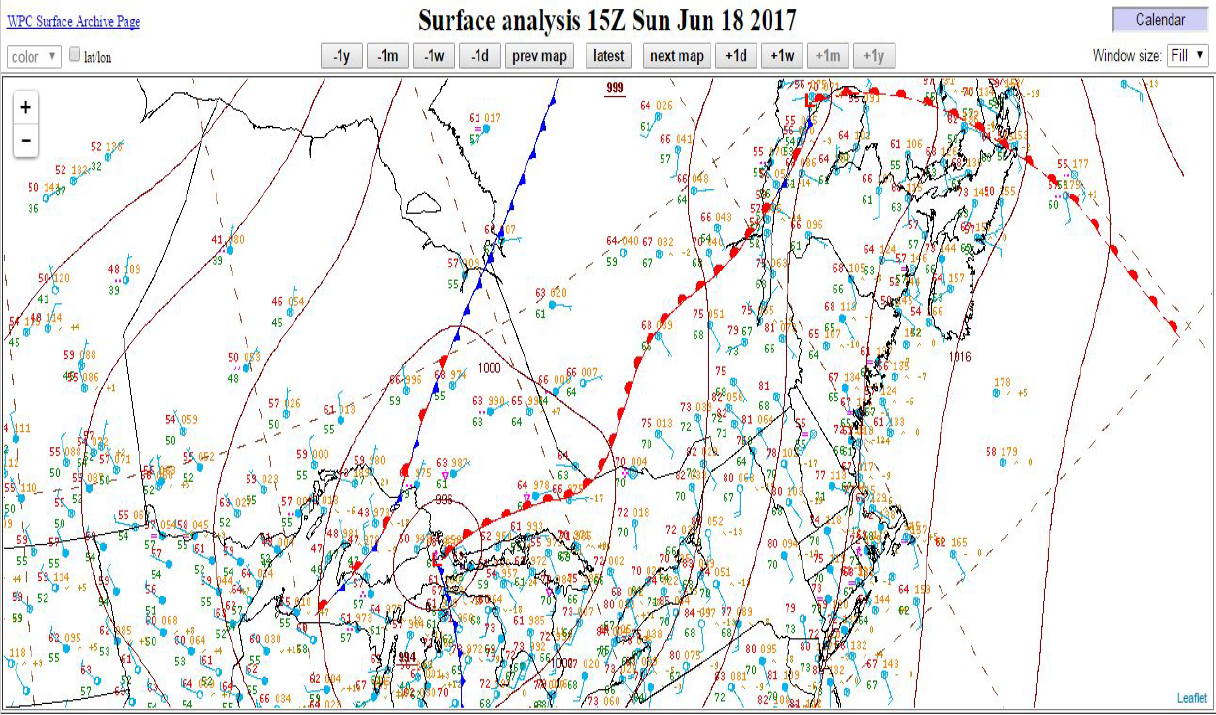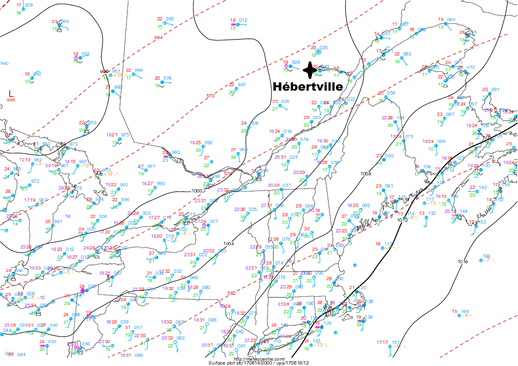 Ce système était prévu de s’intensifier au courant de la journée tout en continuant d’avancer vers le Québec. La carte d’analyse de surface du matin montrait bien le système avec ses fronts. Un front chaud était étendu du Témiscamingue jusqu’au nord de la Gaspésie en passant par le Saguenay. Le front froid lui, était encore assez loin. Il était situé près des grands lacs au Michigan.