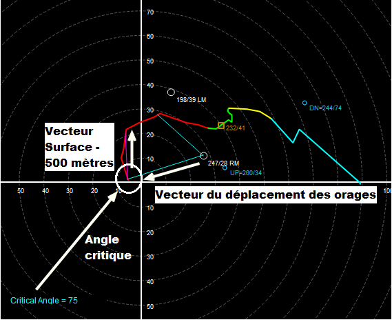 Notre cas ici montrait un angle critique de 75. Avec le tracé du déplacement de l’orage et de la tornade, cela semble concorder avec le point RM (Right Mover) sur l’hodographe.