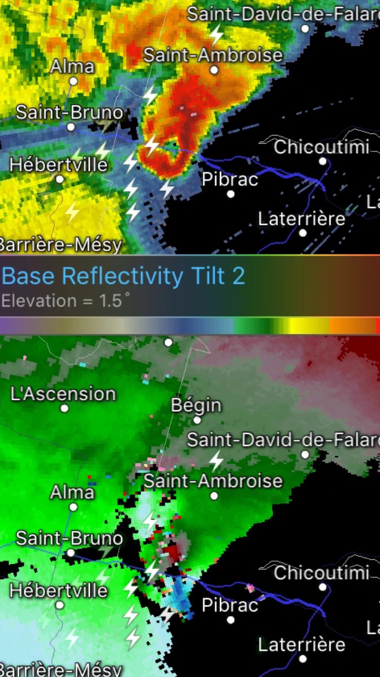 Regardons un peu la tornade vue par le radar maintenant. Le radar du Saguenay est situé près de Lac Castor à environ 50/60 kilomètres de l’événement. À cette distance la hauteur du faisceau radar en mode « tilt 1 » qui est le plus bas est de 600-700 mètres de hauteur (2000-2300 pieds). Pour le « tilt 2 », on parle d’une hauteur de 1600-1700 mètres (5250-5600 pieds).