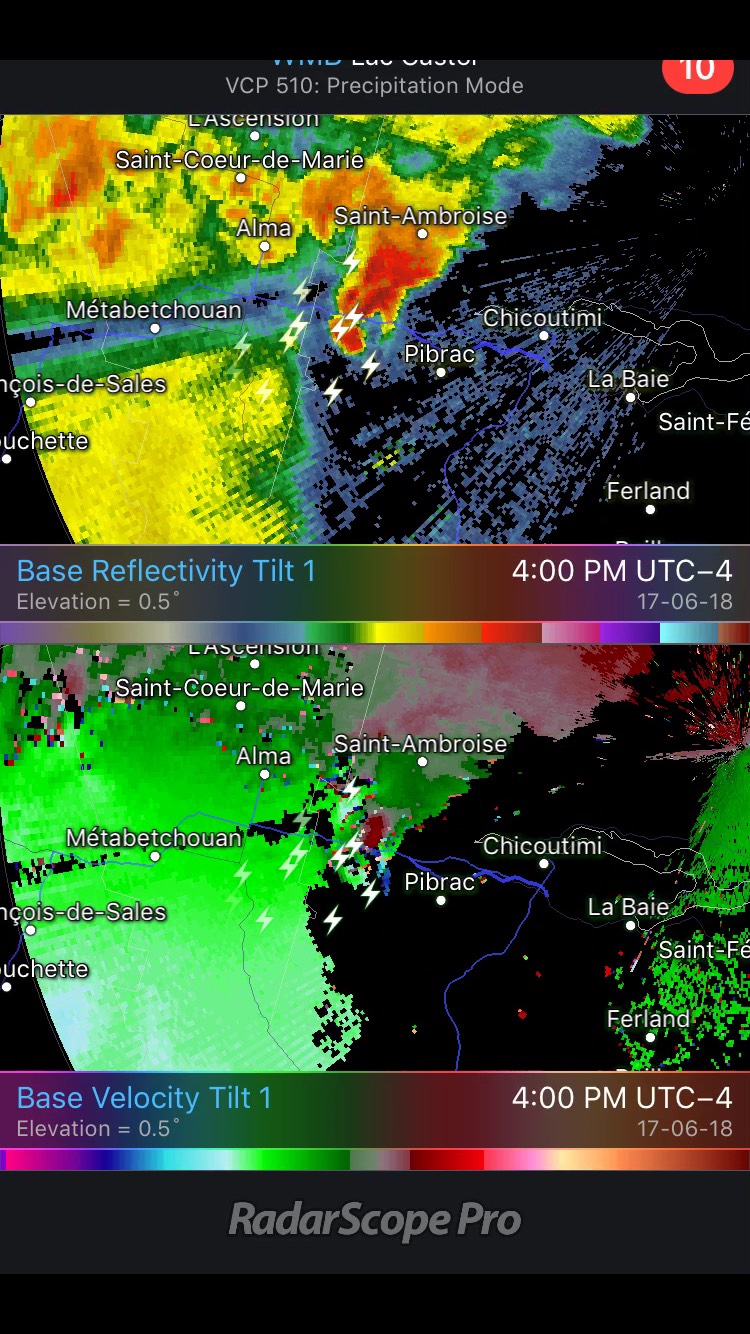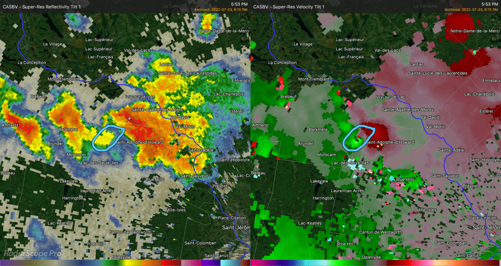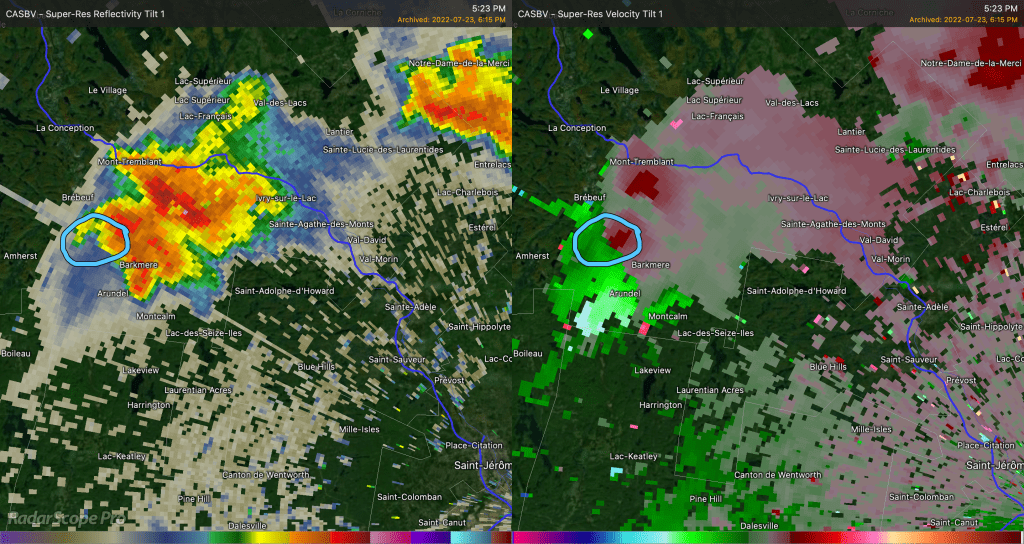 Avec les données disponibles sur RadarScope, j’ai pu déterminer que la force maximale de vélocité qui allait vers le radar était d’environ 42 mètres seconde à ce moment. Les vents à l’opposé du radar étaient d’environ 10 mètres-seconde. En additionnant ces deux chiffres ça donne 52 m/s qu’on divise par deux. Le couplet de vélocité était donc d’une force de 26 m/s.
