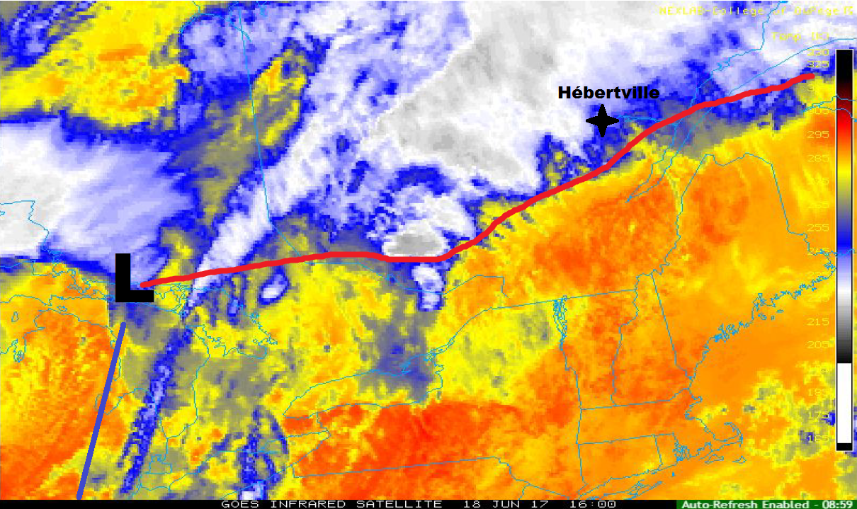Carte montrant le tourbillon atmosphérique et le DPVA à 15 heures HAE. (Étoile noire pointée par la flèche rouge indique Hébertville)