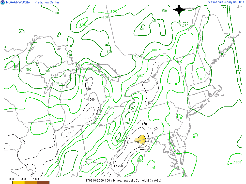 Petite parenthèse ici. Une des raisons pour laquelle les régions dans la vallée du Saint-Laurent n’ont pas connu de tornade s’explique possiblement ainsi. Si vous remarquez sur la carte ci-dessus, les températures dans la vallée ont atteint 30-31°C en plusieurs endroits. Les points de rosés eux sont restés vers 19-20°C. L’écart était beaucoup plus grand, surtout plus on avançait dans la journée avec le réchauffement diurne. Lors de notre chasse nous avons d’ailleurs pus observer le tout. Au début les bases étaient plus près du sol, à ce moment nous avons eu droit à un entonnoir nuageux bref. Plus tard, les bases étaient plus hautes. La carte des LCL le montre aussi.