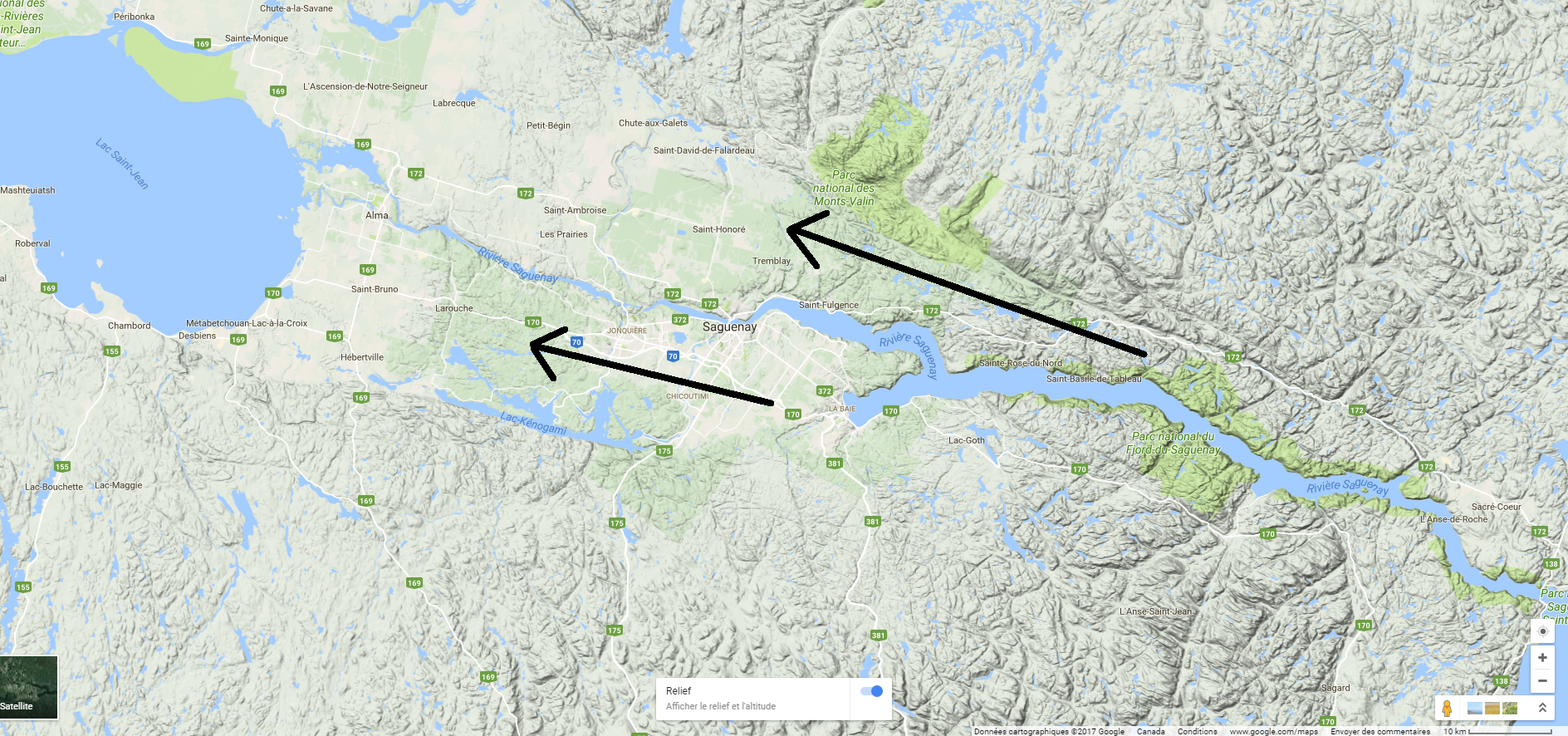 Avec les vents qui étaient de direction est-sud-est près du front, le courant-jet de bas niveau venant du sud-ouest et plus de tendance ouest sud-est en mi-altitude, le cisaillement directionnel était excellent. Le front chaud a très certainement contribué à garder les vents à tendance est, mais aussi, l’effet local de l’orientation de la vallée du Saguenay a certainement joué un rôle. Cette vallée est orientée est-sud-est, parfaite pour une canalisation des vents en provenance de cette direction. C’est un des deux effets locaux qui ont pu contribuer à la formation de cette tornade.