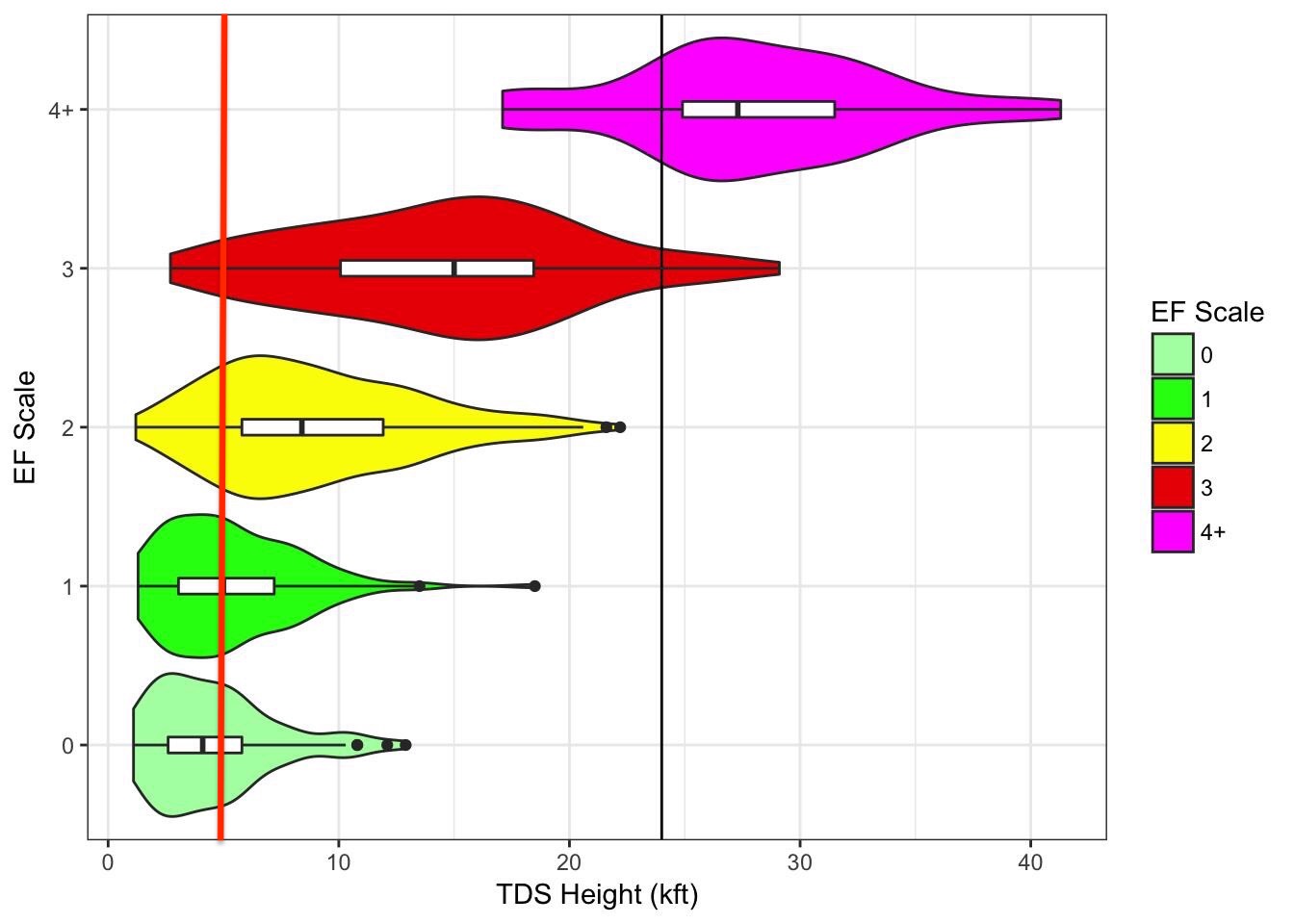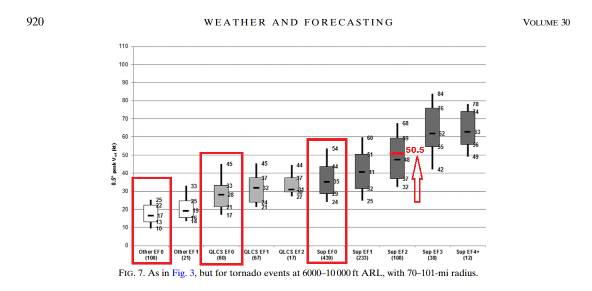 Dans le graphique suivant, les boîtes grises, les chiffres noirs ainsi que les lignes noires verticales représentent les cas soumis par le Storm Prediction Center Américain. Les boîtes représentent les moyennes générales avec la moyenne inscrite à l’intérieur. Les lignes noires verticales sont les cas plus atypiques avec respectivement les cas maximaux et minimaux enregistrés. À noter que ce sont des cas de la région de la Tornado Alley.