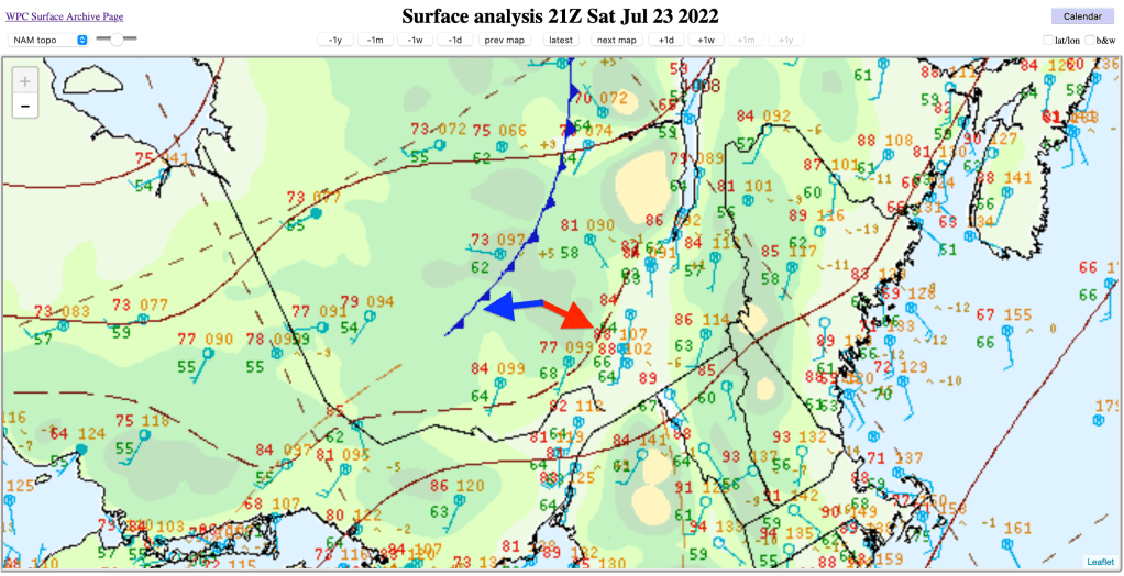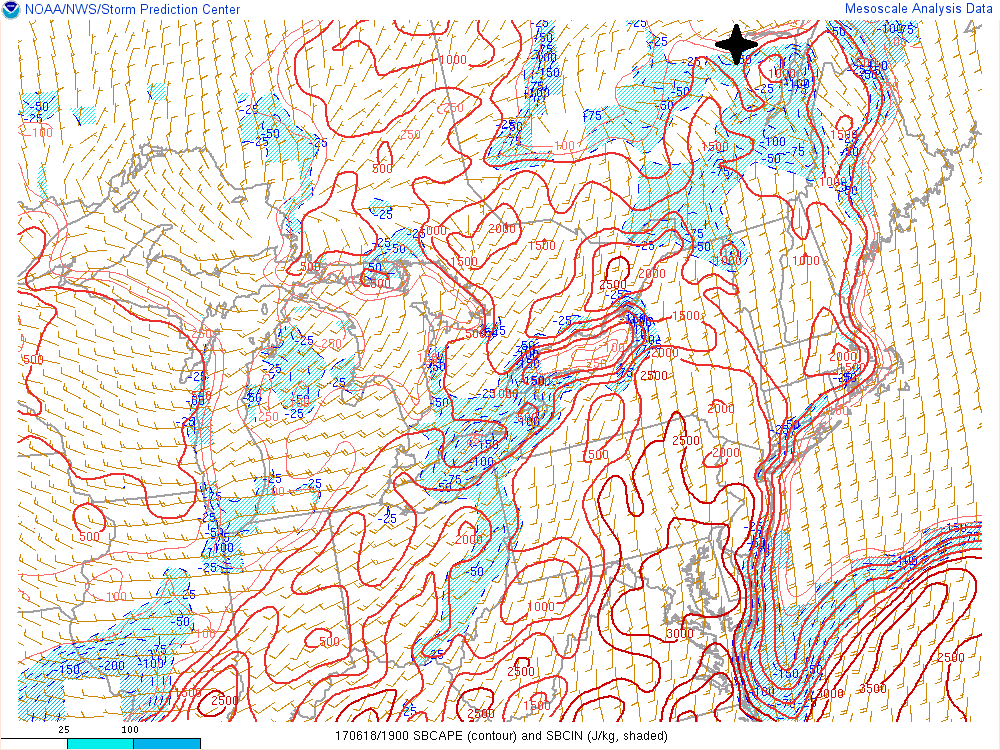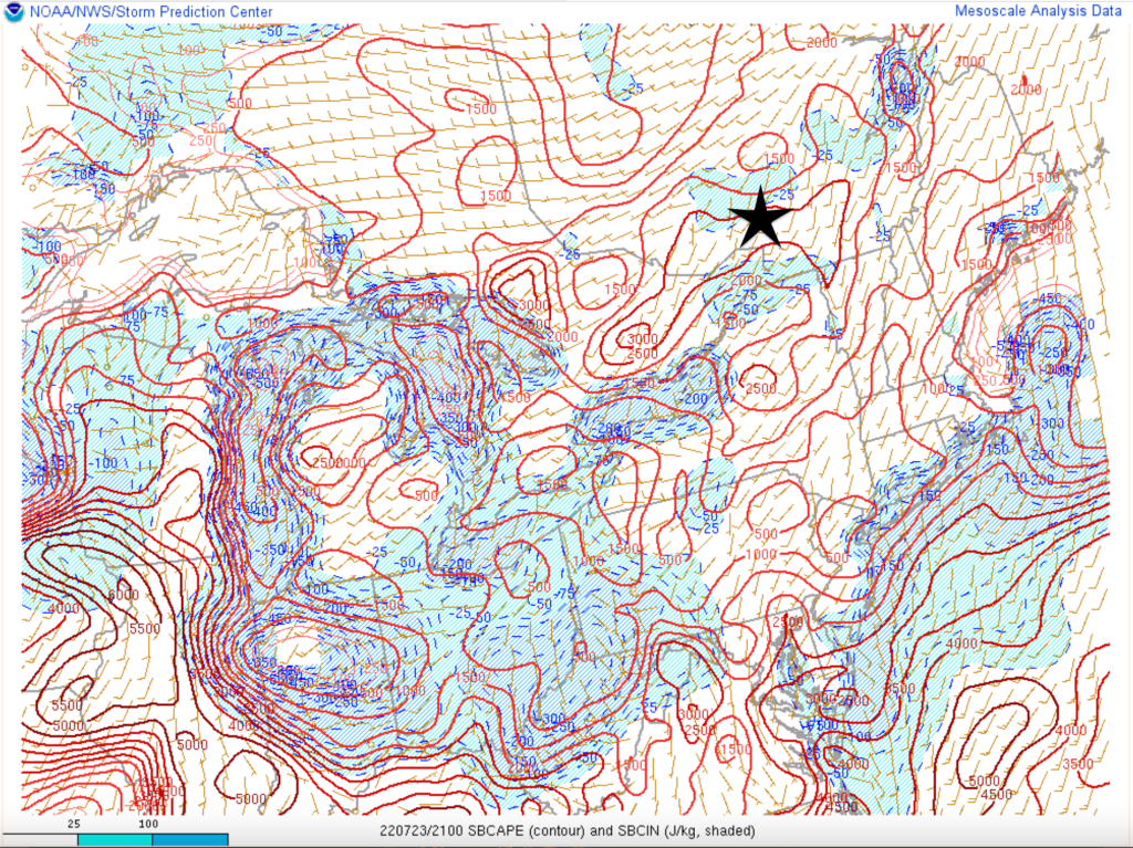 Avec l’avancée du front chaud vers le nord en journée et un petit dégagement qui était dans le secteur chaud, une certaine énergie a pu se développer près de celui-ci. Une énergie qui était très limité, mais au Québec, le CAPE ne semble pas être un facteur primordial pour la formation des tornades.