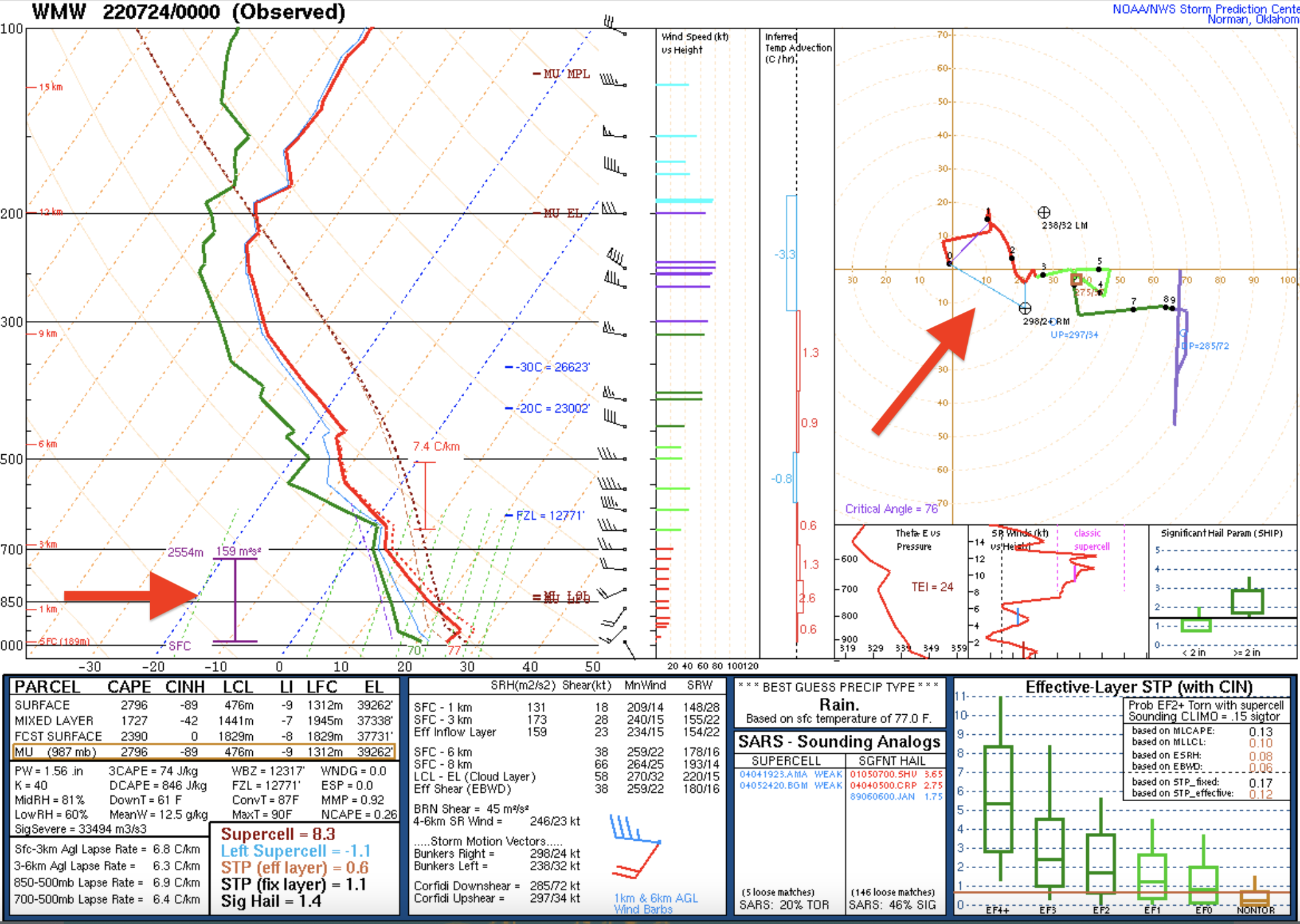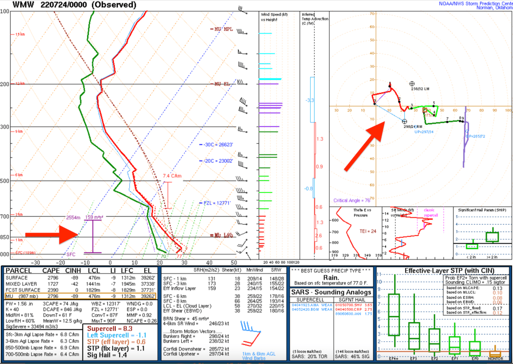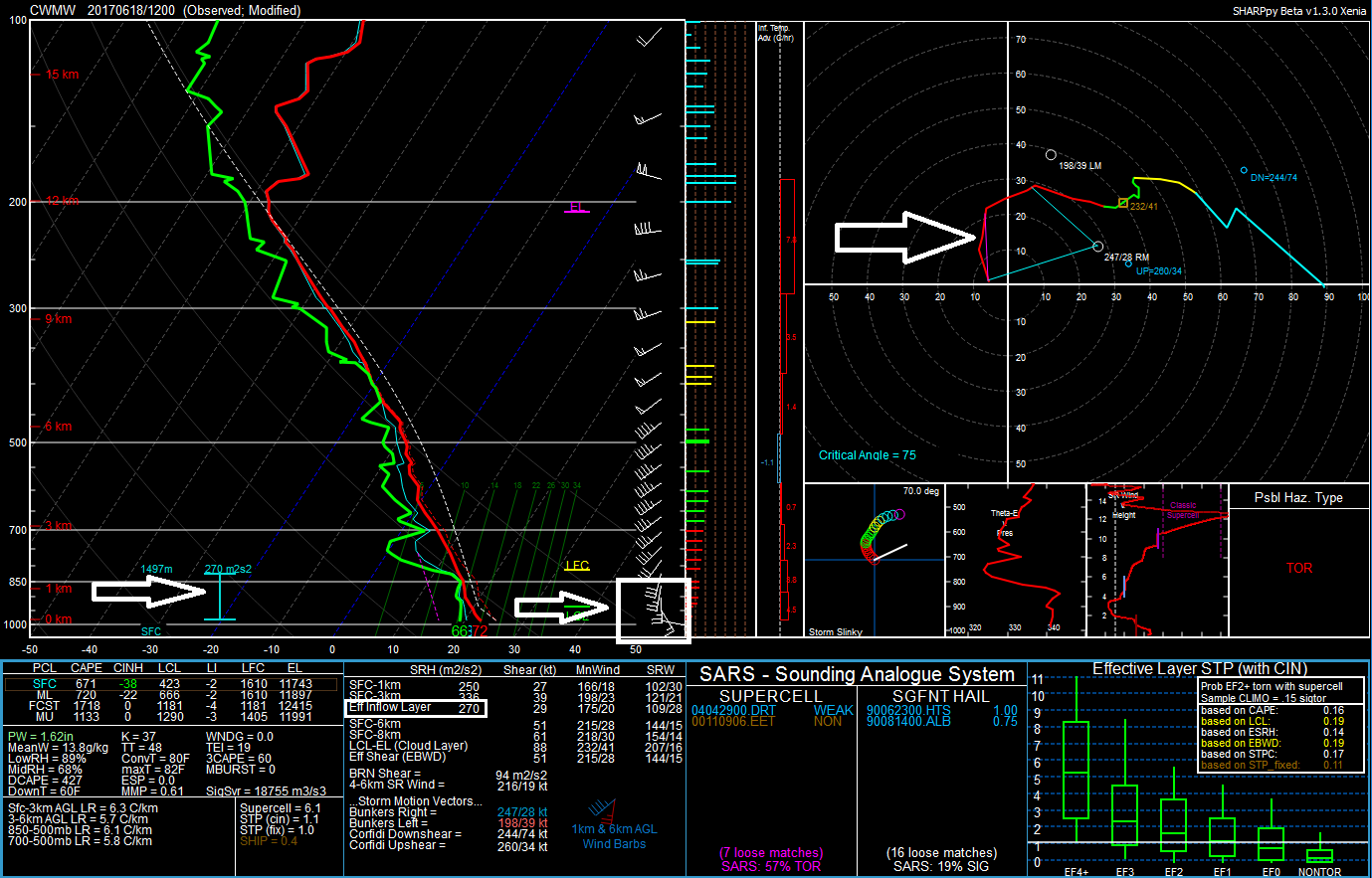 Maintenant, si on regarde l’hodographe, la partie supérieure droite du graphique, on remarque que les vents sont dans un profil très favorable. La quantité d’Hélicité effective qui pouvait être ingérée par les super-cellules bougeant à droite du vecteur normal de déplacement des orages était très bonne, estimé à 270 m2/s2. L’hélicité effective (ESRH) tient compte de l’endroit où les courants ascendants deviennent absolument instables, est aussi souvent utilisée pour faire la différence entre les orages tornadiques ou non, et voir la profondeur de l’hélicité.