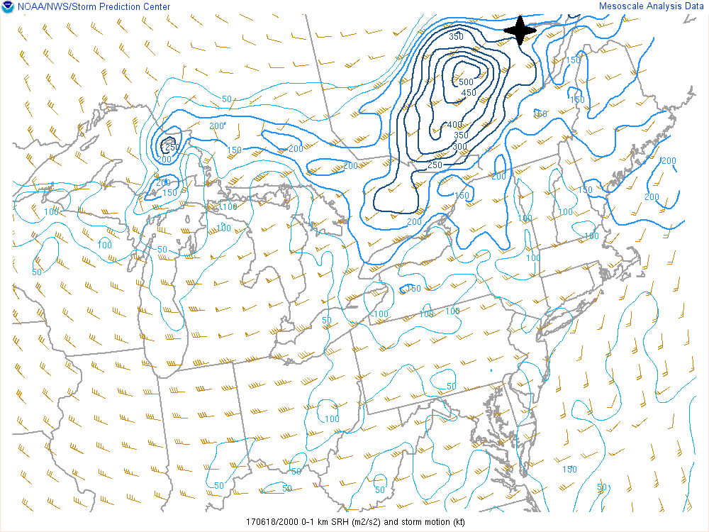 Un autre facteur important à vérifier, l’hélicité. L’hélicité est la quantité mathématique dérivée du cisaillement en vitesse entre une certaine hauteur, du cisaillement en direction entre une certaine hauteur ainsi que de la force et de l’alignement des vents de bas niveau par rapport aux deux autres variables qui sont ingérés dans le courant ascendant d’un orage. Le résultat est en mètre-seconde (m2/s2). L’hélicité entre 0-1 km dans l’atmosphère est souvent reconnue comme un bon indice pour la formation des tornades.