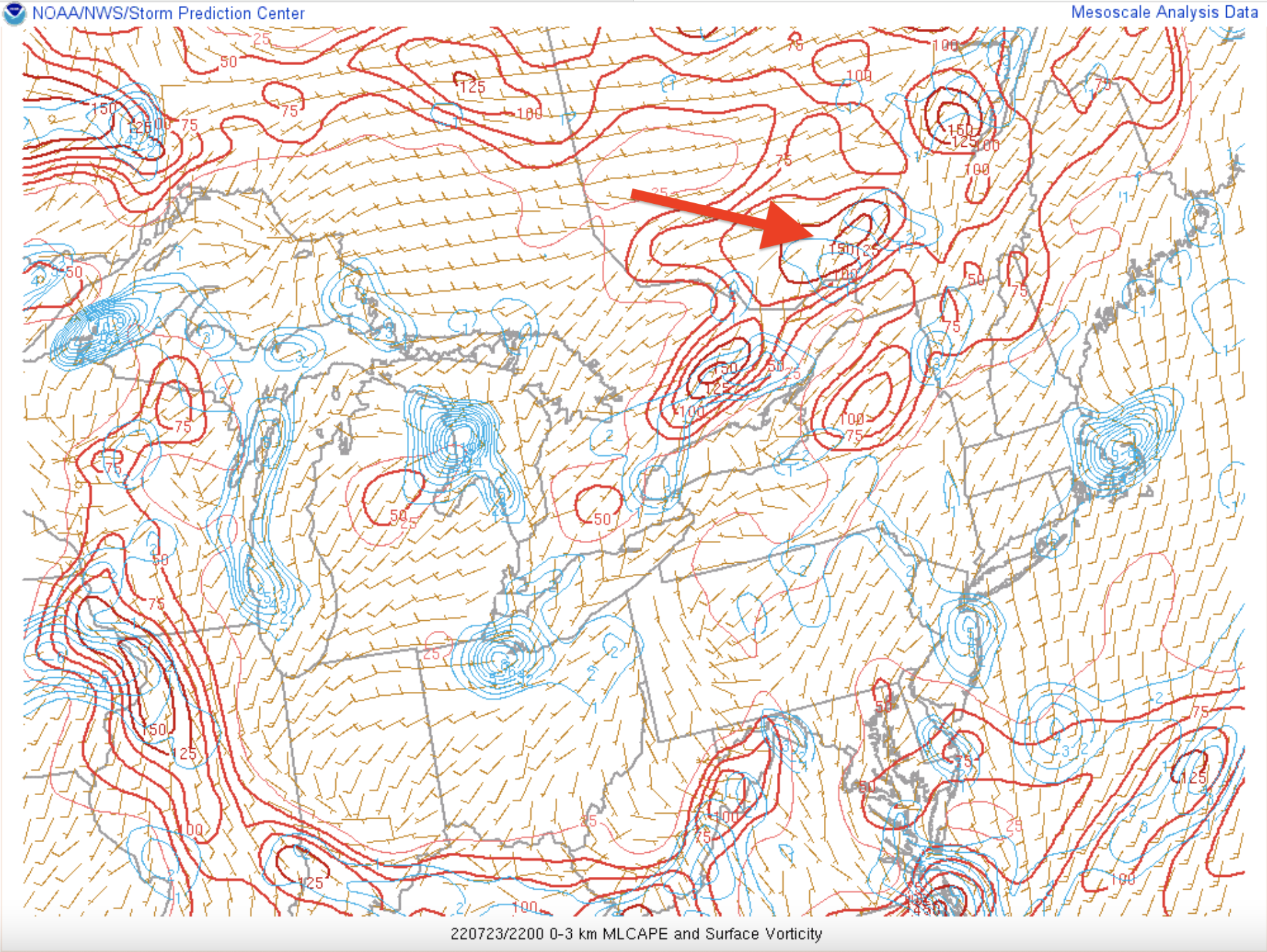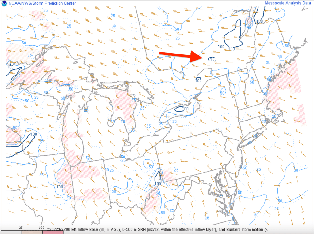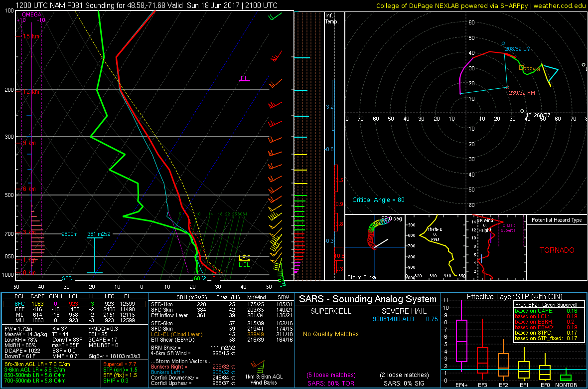 Peu de CAPE et mais un 0-3KM CAPE de valeur intéressante. Ce type de CAPE favorise l’étirement vertical, rappelons-le. Un cisaillement de moyen niveau très bon. Même chose pour celui de bas niveau, autant en force que directionnel. Une combinaison amenée grâce au front chaud non loin, à l’effet local de la vallée du fjord du Saguenay et à l’arrivée d’un bon courant-jet de bas niveau.