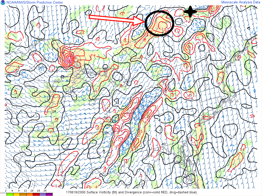 Un autre élément qui a attiré mon attention était une petite zone avec des vents convergent à l’ouest d’Hébertville. Était-ce une petite dépression à méso-échelle qui aurait pu favoriser un certain soulèvement aussi ? Ce n’est qu’une hypothèse. Cette zone était visible quelque temps avant la formation de la super-cellule responsable de la tornade.