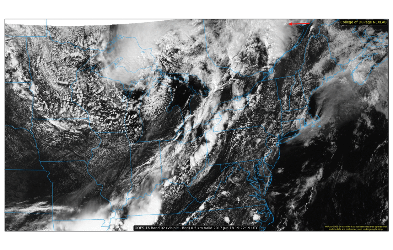 Image satellite au moment de la naissance de l’orage et pendant la tornade au sol. La cellule responsable est indiquée par la flèche rouge.