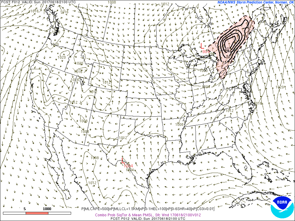 Voici maintenant une carte tirée du modèle d’ensemble SREF disponible sur le site du Storm Prediction Center. Cette carte montre un combiné de plusieurs ingrédients pour la formation de tornades. Elle prend compte les paramètres suivants: MLCAPE d’au moins 500 j/kg; MLLCL d’un maximum de 1.5km en hauteur; Hélicité 0-1 km d’au moins 100 m2/s2; Cisaillement 0-6 km d’au moins 40 noeuds; Une zone où des précipitations sont prévues par les modèles. La formule est indiquée dans le bas de l’image.