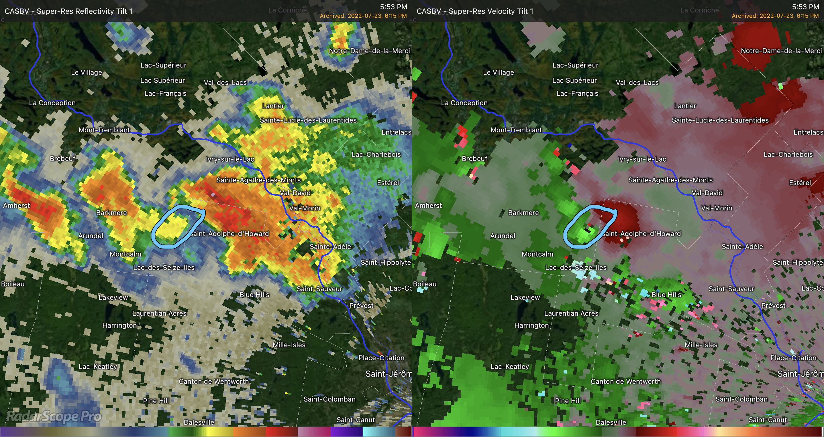 La tornade vue du radar de Lac Castor (interprété par Radar Scope).