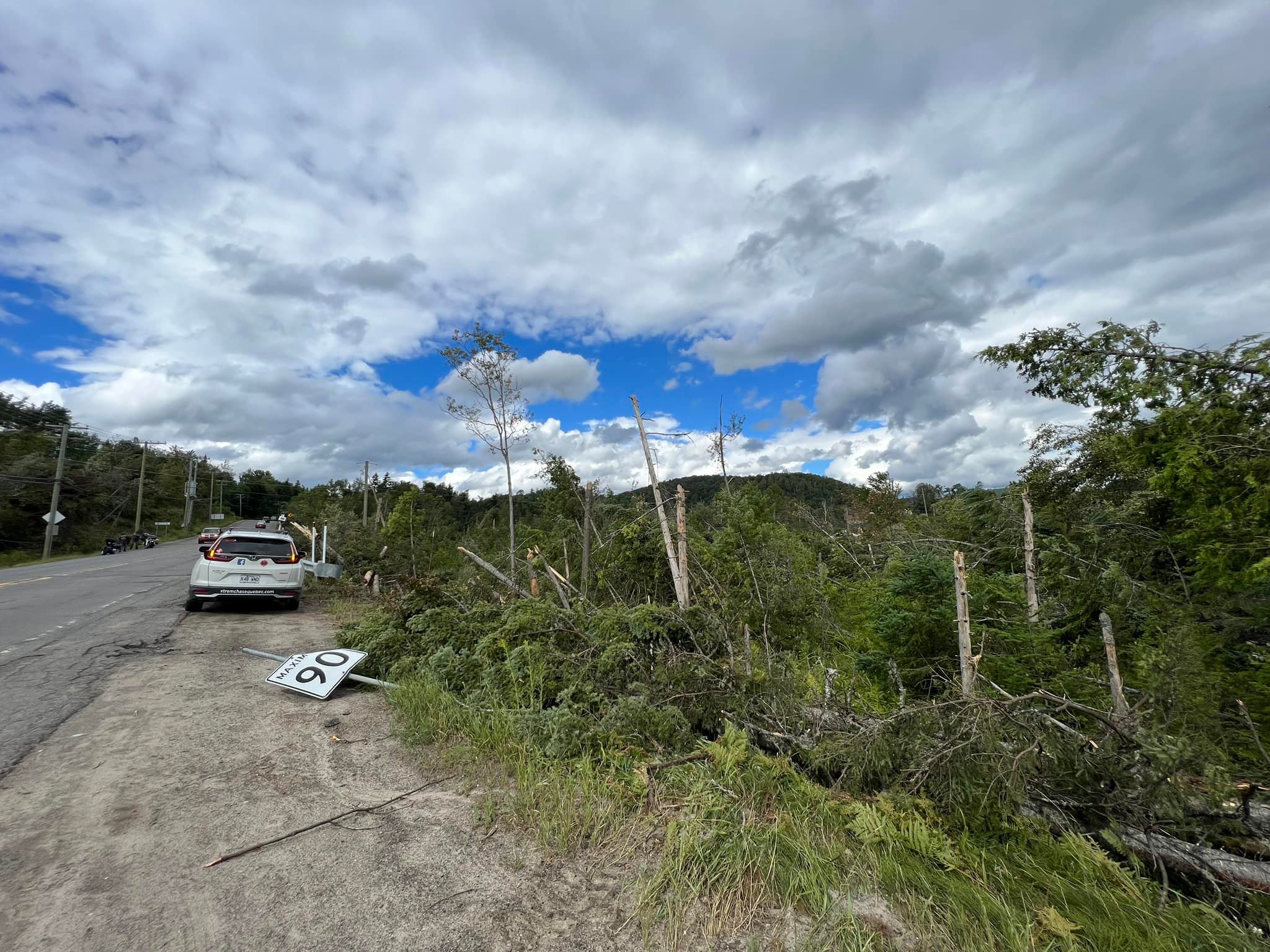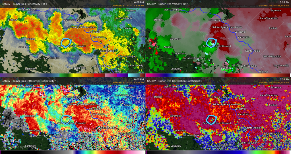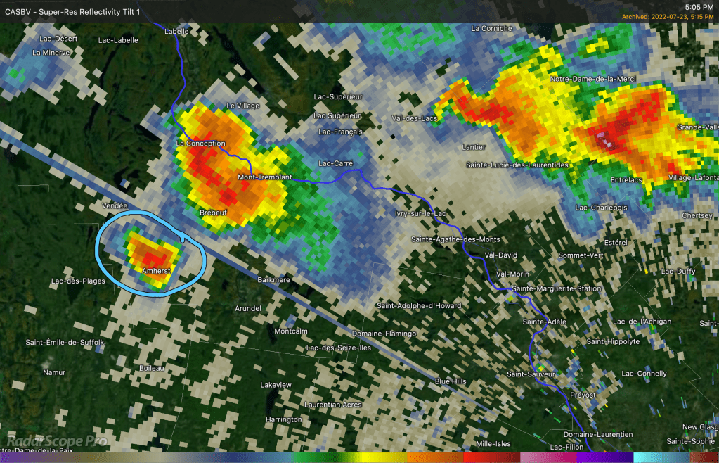 D’autres événements de temps violent se sont aussi produit lors de cette journée. Des rapports de grêle de taille allant de pièce des 5 cents jusqu’à des balles de golf. Une micro-rafale avec des vents estimés entre 140 et 160 km/h dans les hautes Laurentides.