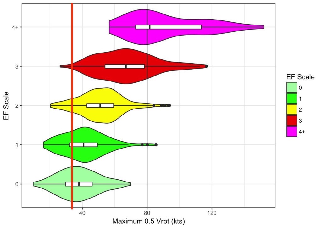 Cette autre image, qui elle comprend des valeurs à l’intérieur de 130 kilomètres du radar, suggère plutôt que le cas présent tombe dans la catégorie « overlap » entre EF1 et EF2. Le « TDS » dans la colonne de droite fait référence à la hauteur du « Tornado Debris Signature » auquel je n’ai pas eu accès.
