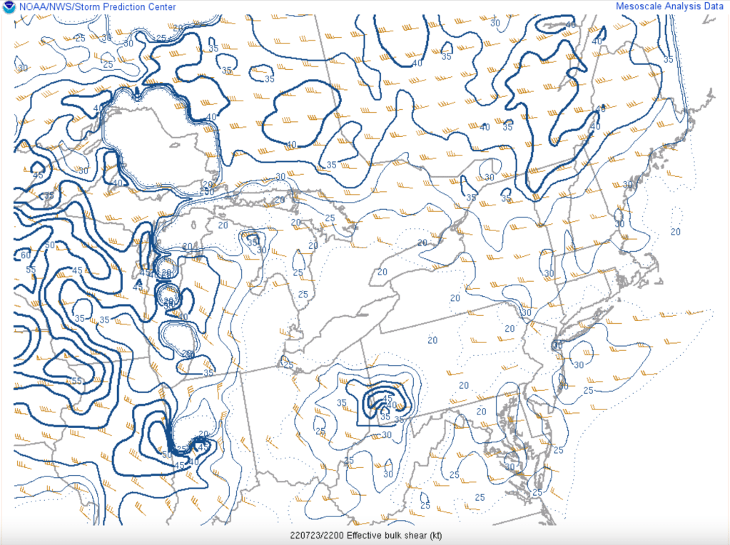 Le cisaillement profond (0-6km) était puissant sur une bonne partie du Québec lors de cette journée. Avec des valeurs avoisinant les 50 noeuds, il était plus que suffisant pour supporter des super-cellules.