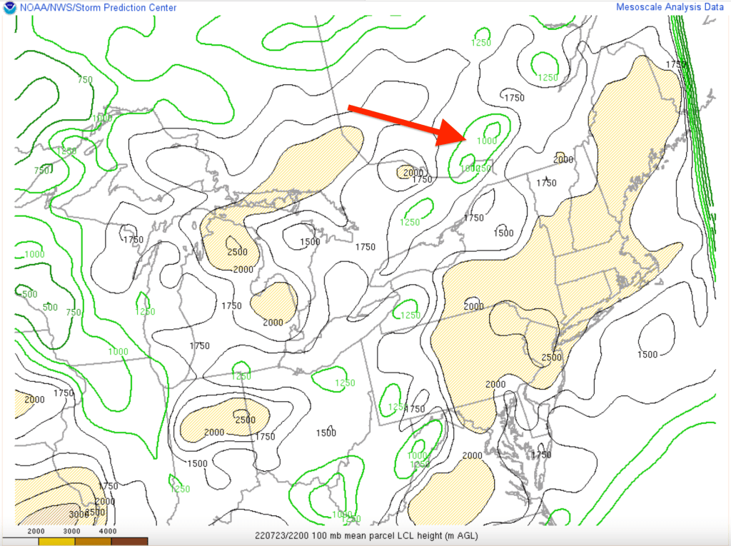 Un écart entre les températures et les points de rosés très favorables dans la zone où les tornades ont eu lieu. Cela mène à un LCL (la base des nuages) beaucoup plus bas en altitude. L’écart beaucoup plus grand explique en partie pourquoi il n’y a pas eu de tornade plus au sud.