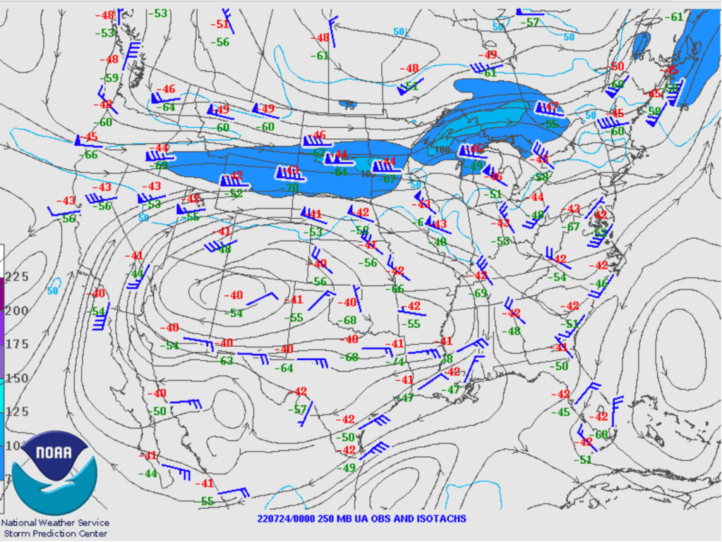 Les zones importantes à retenir sur cette carte son celles entourées de bleus. Ces zones représentent l’endroit ou un mouvement ascendant est détecté. Les zones rouges représentent plutôt un mouvement descendant. Les zones colorées avec des X représentent des poches de tourbillons.