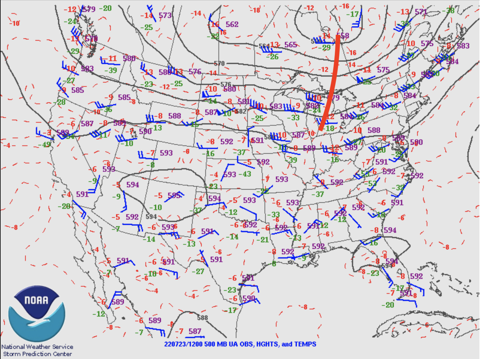 En mettant toutes les choses en perspective, voici ce qui donnait le profil atmosphérique potentiel au moment de la tornade. La carte ci-dessous est une carte d’analyse de surface que j’ai recrée manuellement à partir des données présentes sur la page de mésonalyse du Storm Prediction Center.