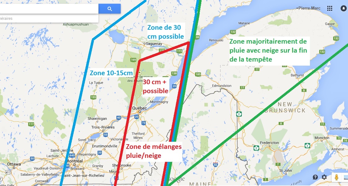 Montréal et les environs auront un 10 cm et ce sans mélanges. Les régions plus à l’est comme la Mauricie, le centre du Québec et le Lac St-Jean pourrait voir du 20 cm sans trop de mélanges non plus. Les choses se compliquent pour les régions de Québec, Beauce, Estrie, Charlevoix et une partie du Saguenay et du Bas St-Laurent. Ces régions seront sous l’influence de plus de chaleur ce qui devraient apporter des mélanges comme du verglas et de la pluie. Néanmoins certains de ces endroits pourraient voir 30 cm car les précipitations seront intenses par moments.