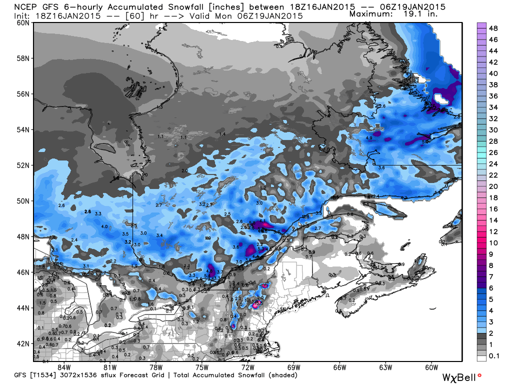 La dépression qui se transformera en tempête dimanche apportera de bonne quantité de neige pour la rive nord du fleuve des samedi soir. La région de Québec, Mauricie, Laurentides, Lanaudière et le secteur nord du Saguenay aurons de 5 à 15 cm de neige. Les secteurs en montagne serons les plus privilégiés pour les fortes accumulations.