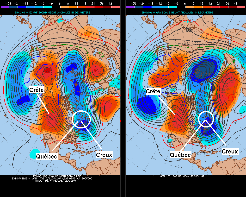 L’euro (gauche) et le GFS (droite) montrent beaucoup de similarité sur le scénario global à venir. Un tel patron météo amène sur le Québec du temps froid et incertain alors que dans l’ouest du continent, le temps est plus chaud et sec. Les descentes d’air arctique sont beaucoup plus susceptibles d’arriver. Les systèmes météo eux peuvent aussi se former en grand nombre et varier en trajectoire. Par exemple, un flot atmosphérique comme celui-ci est favorable pour les clippers Albertains tout comme les développements côtiers possibles. Le risque de tempêtes sur certains secteurs, surtout l’est, s’en retrouve donc rehaussé.