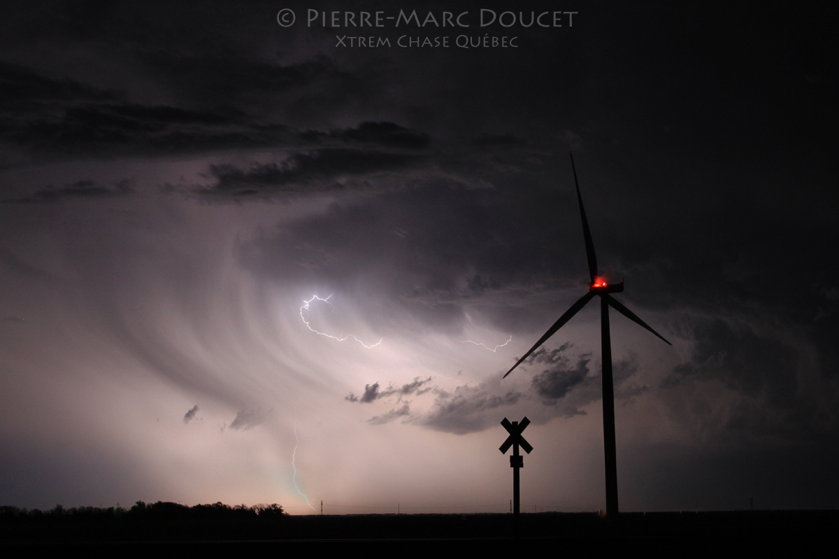 Nous sommes donc partis vers Garden City pour nous mettre en position. Des orages ont commencé à lever mais comme nous le craignions, ils sont demeurés surélevés. Nous avons eu droit à plusieurs petits gustnado cependant. La principale menace avec ces orages était les vents forts dus à l’outflow (courant descendant) et la grêle. Nous avons eu droit à quelques beaux spectacles tout de même.