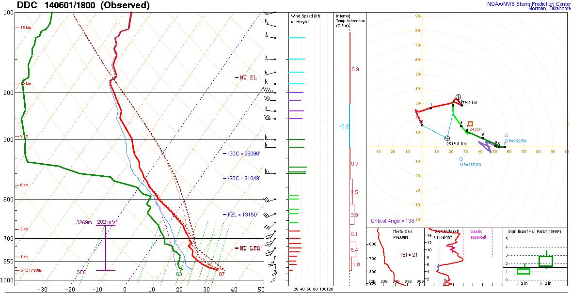 Il y avait une ombre au tableau cependant, c’était l’écart entre les points de rosée et la température. En effet, ils étaient de l’ordre de 25-30°F (13-15°C) ce qui est un bon écart. Le risque que les orages manquent d’humidité et soient avec des bases hautes (sur-élevé) était très probable. Ce genre de scénario est moins bon pour les tornades. Par contre avec le relief des hautes plaines qui est un peu plus élevé cela donnait un peu plus d’espoir.