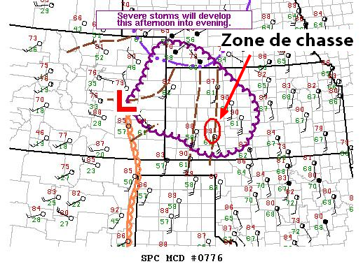 Nous sommes partis de Hays au Kansas ce matin-là dans l’espoir de voir quelques bonnes supercellules plus tard dans la journée. L’atmosphère semblait plutôt bonne avec un cisaillement intéressant, de l’énergie et deux creux en surface étaient présent. Nous comptions sur celui plus à l’ouest pour que les orages se forment et le deuxième creux à l’est donnait une zone de tourbillons un peu plus grandes ce qui est bon pour le développement des tornades.
