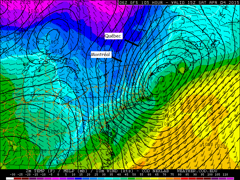 Il y a beaucoup de chaleur à venir jeudi et vendredi sur le sud du Québec. Des températures entre 7°C et 15°C ! Mais…. Il y a un mais.. Samedi une forte dépression sur la côte est pourrait nous apporter un tempête de neige !