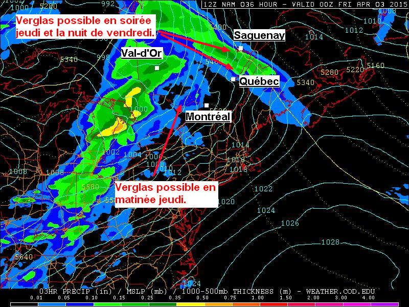 Pour tout le sud du Québec, on parlera de pluie jeudi. Le verglas et la neige va se transposer plus tard en journée sur le centre et le centre-est. Les régions du nord de la Mauricie, Lac St-Jean/Saguenay, Québec, Beauce-Appalaches et le Bas St-Laurent pourront aussi voir un 5mm de verglas en soirée jeudi et dans la nuit de vendredi alors qu’un autre 10 cm tombera sur ces secteurs. Il y a aussi un risque de mélanges avec de la pluie plus le temps avancera.