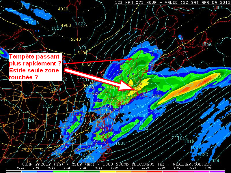 Petite mise à jour pour samedi maintenant. Avec les modèles d’aujourd’hui il semble que la dépression prévue passe son chemin plus rapidement. La théorie qu’avait évoqué un de nos amis Facebook semble être la bonne. Le courant-jet n’ayant pas un « tilt », ou une courbure assez prononcé, fera en sorte que la dépression passe son chemin plus vite, donc laissant moins de précipitations sur moins de secteurs.