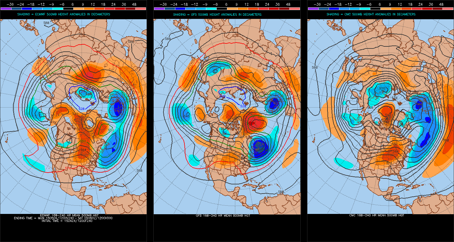 Anomalie prévus par les modèles Euro, GFS et du CMC pour les 8 à 10 prochains jours.