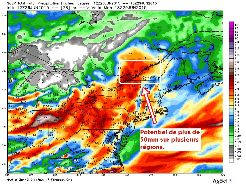 Tout le sud du Québec, y compris Montréal, l’Outaouais, les Laurentides, Lanaudière, Montérégie, Estrie, la Mauricie et le Centre-du-Québec ont des risques de voir du 50mm d’eau et plus entre dimanche et lundi. Les solutions diffèrent un peu d’un modèle à l’autre quant à savoir quelle région sera la plus touchée mais la constance de la force des précipitations est la.