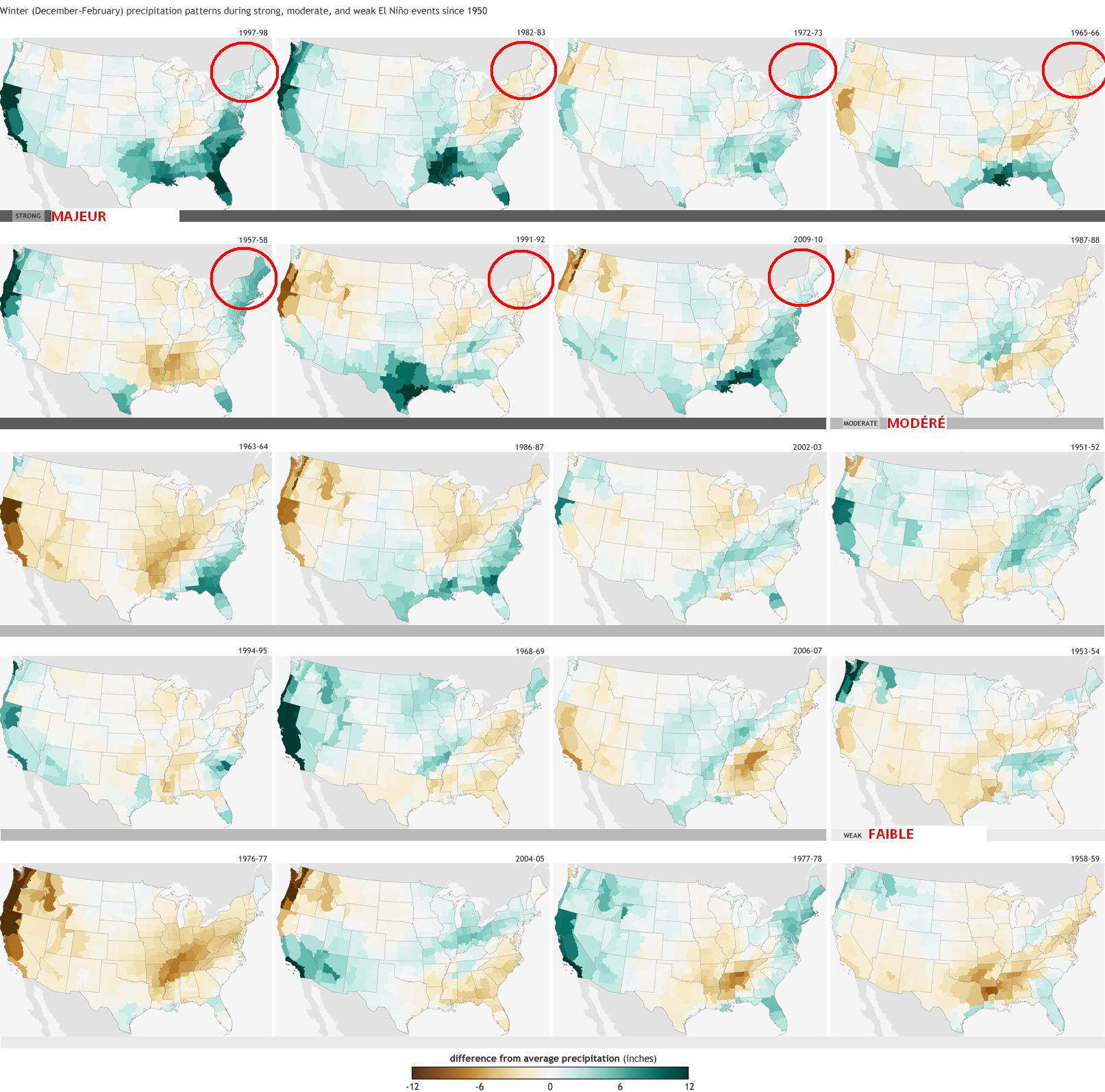 Encerclé en rouge, il s’agit du nord-est américain, donc nos états voisins. On peut voir que pour les 7 évènements majeurs survenus depuis 1950, il y en a eu vraiment 3 ou on peut dire que les précipitations ont été au-dessus de la normale. Pour les 4 autres, c’était pas mal dans la normale ou en dessous. On ne peut donc affirmer qu »un El Nino majeur, sans autre interaction atmosphérique, apporte plus ou moins de précipitations dans le sud du Québec.