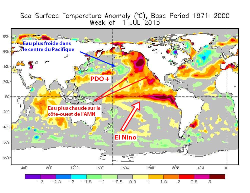 Carte des anomalies de température à la surface de l’océan pour la semaine du 1er juillet 2015. El Nino et le PDO + sont bien visibles.