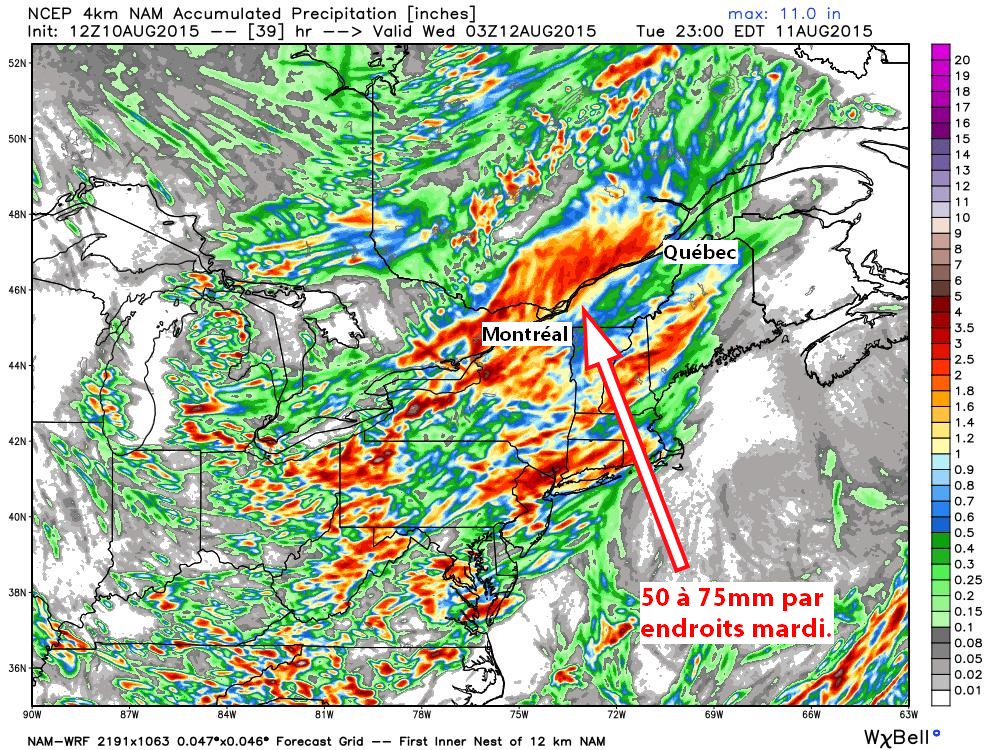 Plusieurs zones vont recevoir beaucoup d’eau dès ce soir jusqu’à tard demain. Les régions de l’Outaouais, des Laurentides, Lanaudière, Montréal, Mauricie, Québec et la partie nord de la Montérégie pourront recevoir un 30 à 50mm. Certaines de ces régions, surtout au nord du fleuve pourraient même recevoir jusqu’à 75mm !