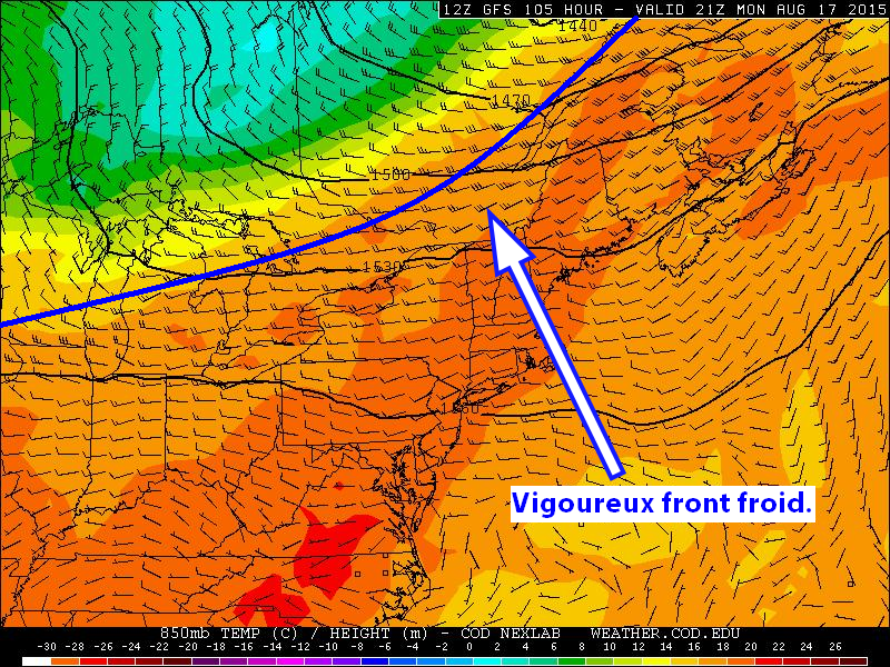 Pour lundi, un bon front froid va faire son entrée par l’ouest de la province. Celui-ci va descendre au courant de la journée et des orages forts à violents pourraient se former devant car il semble qu’il y aura assez d’énergie accumulée avec la chaleur et l’humidité des jours précédents. C’est encore loin cependant, donc il faudra voir le timming de ce scénario ainsi que le mode convectif et quelles régions exactement seront les plus affectés. Pour l’instant, il semble que le mode convectif soit surtout une ligne d’orages mais des supercellules discrètes sont toujours possibles dans les zones où le cisaillement du vent sera moins en parallèle avec le front froid. À suivre.