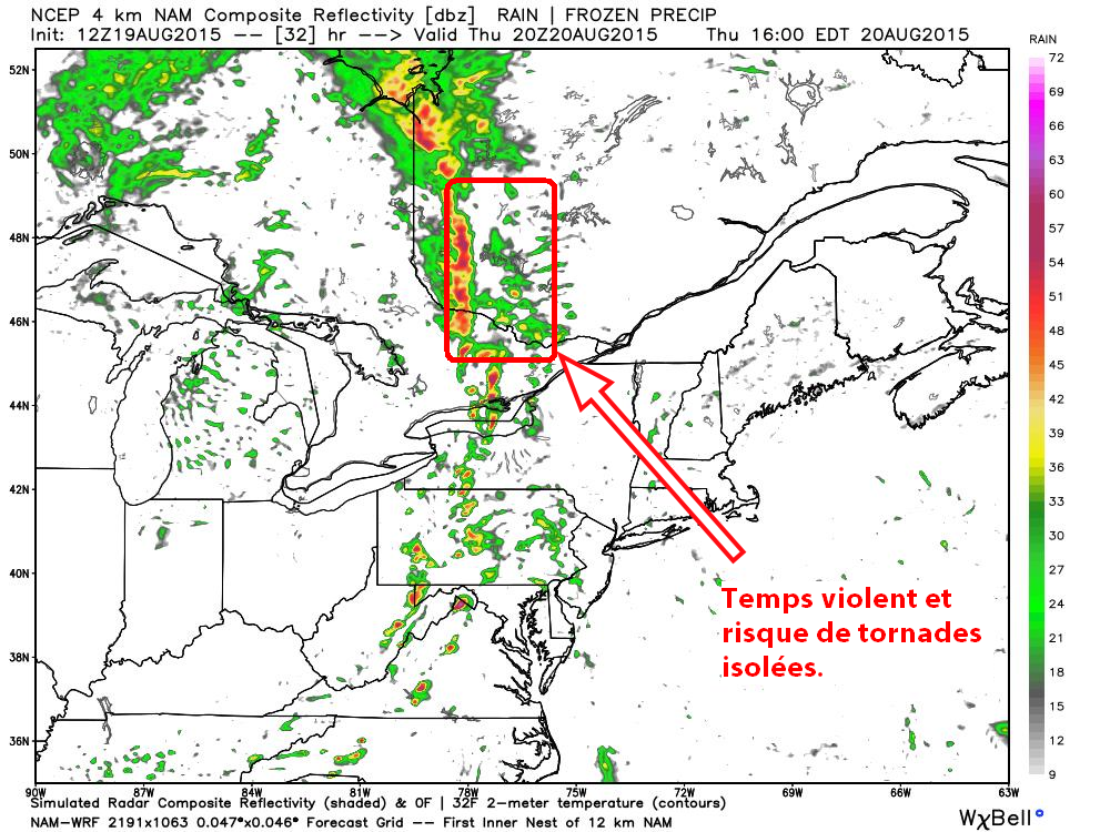 Le tout devrait commencer assez tôt en journée. Vers l’heure du midi et se poursuivre une bonne partie de la journée. Pour plus de renseignements sur l’analyse de la situation, rendez-vous sur ce lien ! https://xtremchasequebec.com/2015/08/18/analyse-du-20-aout-2015/