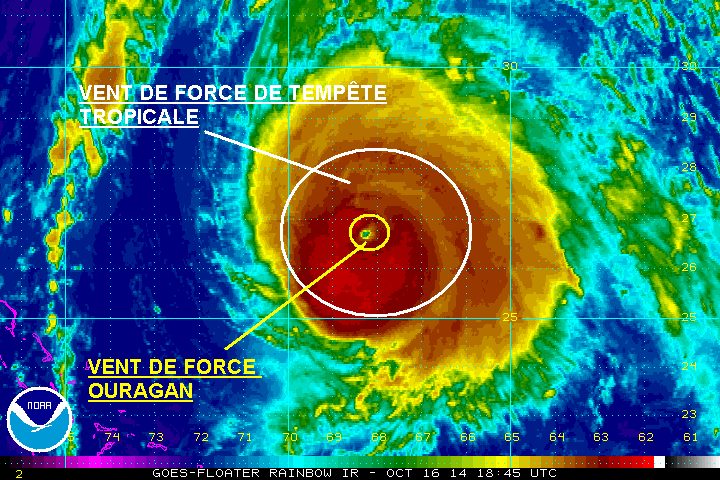À l’intérieur du cercle blanc se trouve les vents de force de tempête tropicale (65 à 119 km/h). Ces vents peuvent aller et parfois dépasser jusqu’à 500 kilomètres de l’oeil.