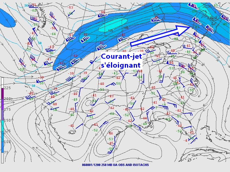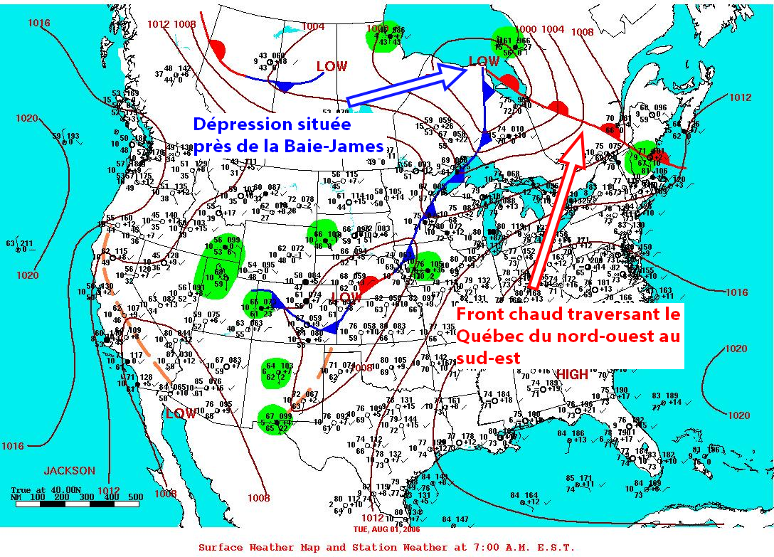 Pendant la journée du 1er Aout 2006, le Québec était en quelque sorte pris en sandwich entre un système dépressionnaire situé près de la Baie-James et un gros anticyclone dans le sud-est des États-Unis.