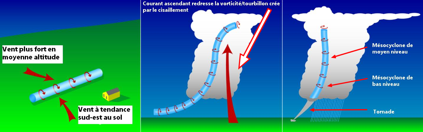 Nous avons donc notre rouleau compresseur qui tourne, encore plus de tourbillon au sol produit par le cisaillement directionnel et un courant ascendant qui redresse le tout de façon verticale dans le nuage d’orage qui se sera formé car l’atmosphère est instable et humide. Le mésocyclone de moyen niveau se forme, si l’helicité est suffisante, le mésocyclone de bas niveau deviendra plus fort et cela peut engendrer une tornade !