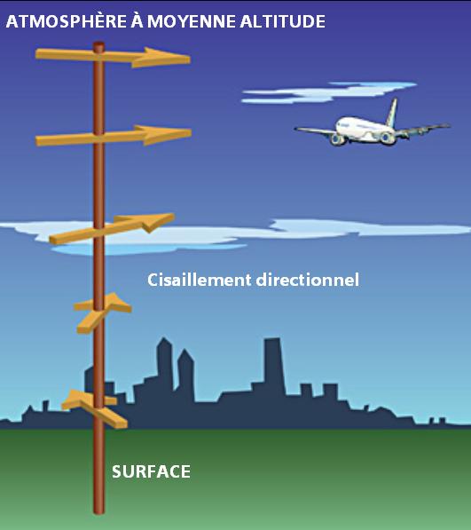 Le cisaillement en vitesse est la différence entre la force des vents au sol et celle en moyenne altitude.