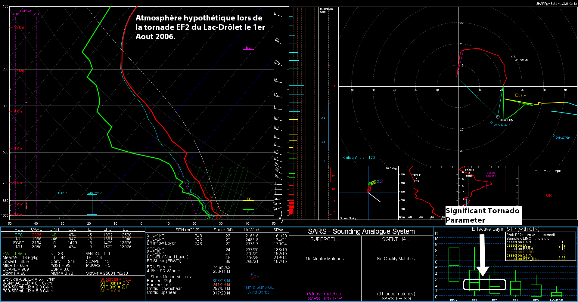 Récapitulons un peu le tout. Nous avions donc beaucoup d’instabilité présente (environ 3000 de CAPE), juste assez d’humidité disponible, du soulèvement possible avec des outflow boundaries dans ce secteur et le cisaillement 0-6 km de 35 noeuds, plus qu’intéressant pour la formation d’orages violents, et un cisaillement directionnel 0-1 km de 20-25 noeuds très suffisants pour la formation de tornades. Le front chaud était devenu quasi stationnaire en Estrie/Beauce, ce qui augmentait localement l’helicité et créait une petite zone de convergence. En plus, il y avait possiblement une petite outflow boundary tout près de Lac Drolet. On ne pouvait demander mieux pour avoir une tornade !