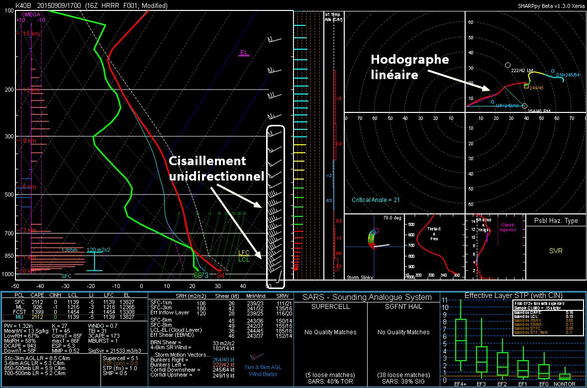 Il s’agit d’une mesure importante pour la rotation mais aussi pour que le courant ascendant ne soit pas noyé dans les précipitations de l’orage. Si vous avez une différence de vents trop faible entre la moyenne altitude et la surface, les précipitations tomberont directement dans le courant ascendant ce qui l’étouffera et mènera à la mort de l’orage. Voilà pourquoi il est préférable d’avoir au minimum 30 noeuds de différence.