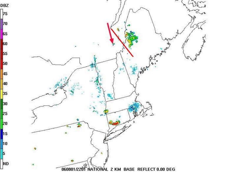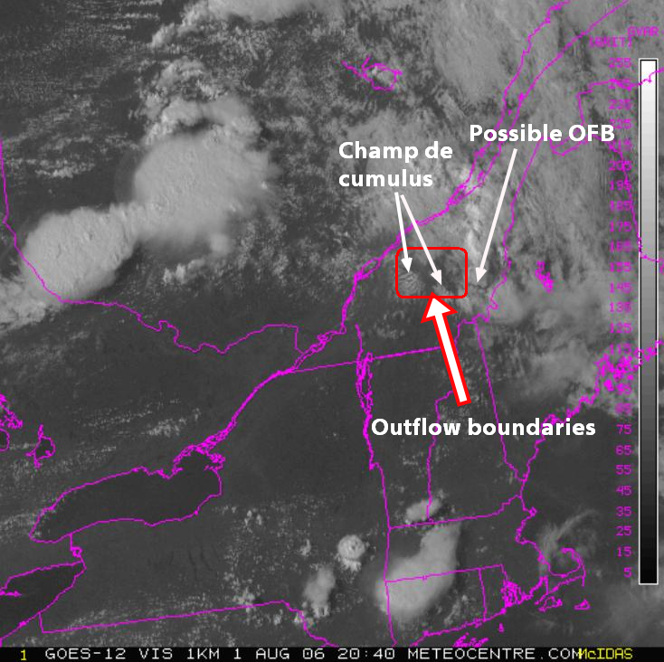 On peut voir les outflow boundaries au radar quand elles sont proches de celui-ci, mais on peut très bien les distinguer au satellite aussi. Sur l’image du haut, on voit qu’en fin d’après-midi, les orages se sont éloigné de la région de l’Estrie. Dans la zone entourée en rouge, on voit aussi des zones sans nuages alors que des petits champs de cumulus se forment alentour. Ce sont des outflow boundaries. On voit aussi une mince ligne pointée juste à l’extérieur du rectangle rouge, il s’agit possiblement d’une petite outflow boundary aussi. Le village de Lac-Drolet est situé tout près de cette étroite ligne.
