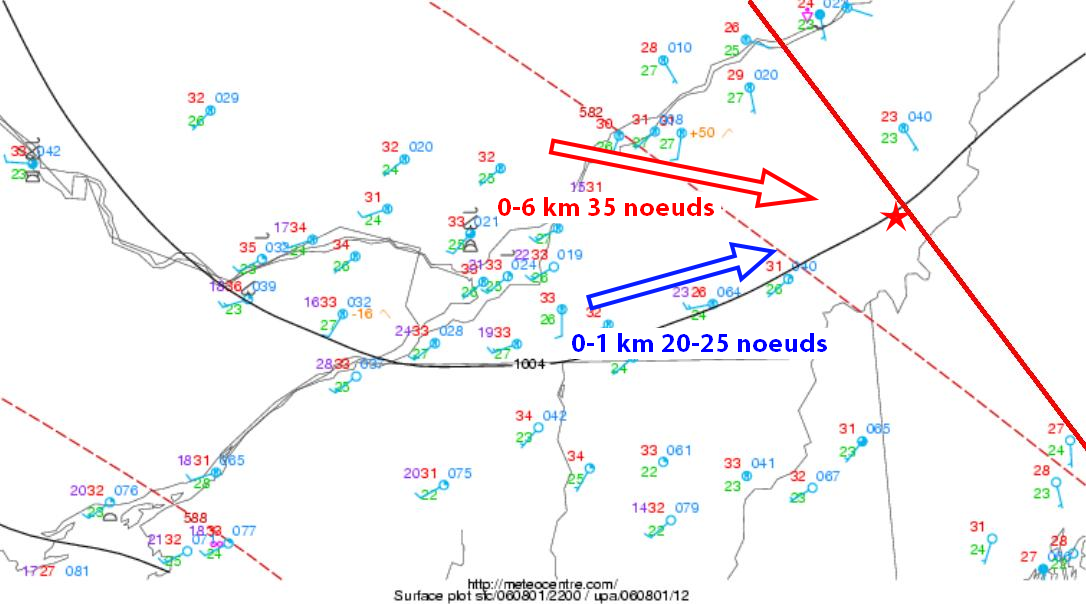 Carte de surface montrant le cisaillement (flèche rouge et bleue), le front chaud (ligne rouge) et Lac Drolet (étoile rouge).
